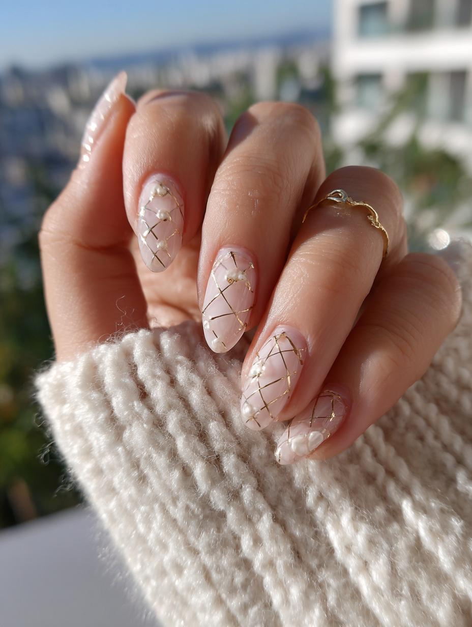 This sophisticated nail design features a stunning geometric glass effect created with thin golden wire lines crossing over a translucent nude base. The intricate lattice pattern gives the illusion of delicate stained glass windows, while small pearl and crystal embellishments add an extra touch of luxury. This quiet luxury manicure strikes the perfect balance between artistic complexity and refined elegance, making it ideal for special occasions or when you want your nails to be a subtle statement piece.