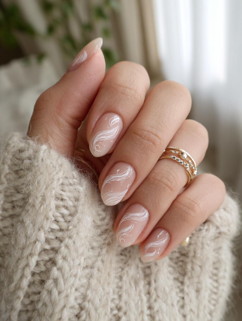 This ethereal nude manicure with delicate white swirl details epitomizes quiet luxury nail art. The soft, natural base color enhanced with flowing abstract patterns creates an understated elegance that speaks volumes without being loud. This sophisticated design works beautifully for both everyday wear and special occasions, proving that luxury lies in the details rather than bold statements.