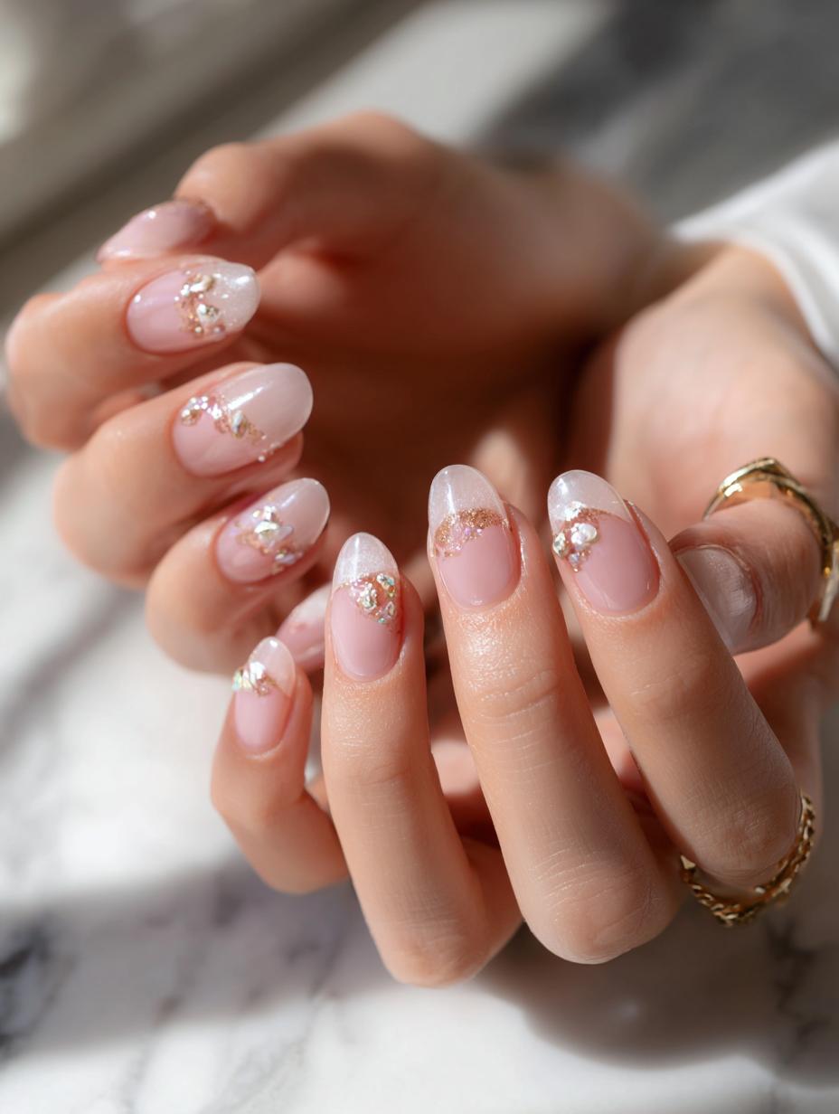 This understated yet sophisticated nail art perfectly embodies the quiet luxury aesthetic with its soft nude pink base and carefully placed pearl and gold foil accents. The translucent pink polish creates an effortless, natural look while the strategic placement of small pearls and delicate gold leaf details adds just enough sparkle to catch the light. This manicure is ideal for those who want elegance without ostentation – perfect for boardroom meetings, wedding events, or any occasion where refined sophistication is key.