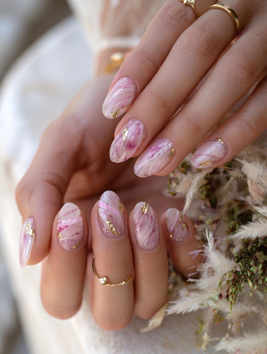 Translucent Pink Marble Nails with Gold Foil Accents