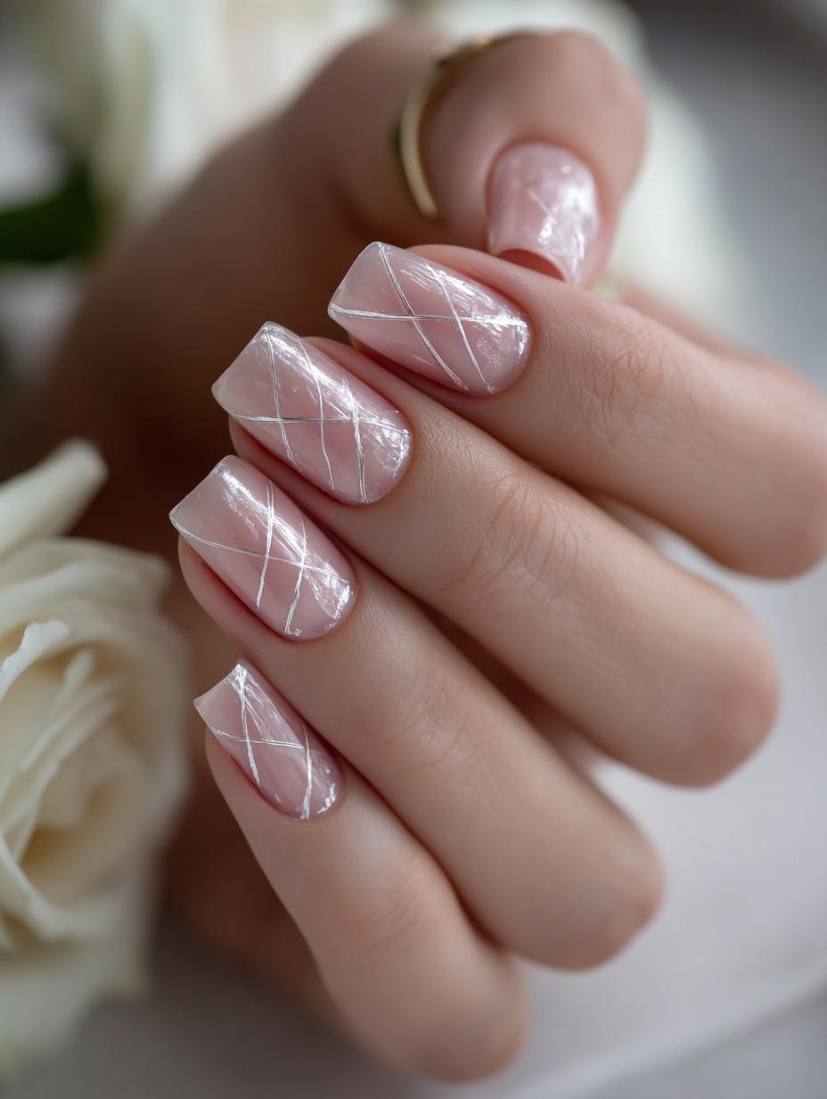 This sophisticated nail design features a translucent pink base with delicate white geometric lines that create an elegant glass-like effect. The intersecting linear pattern adds subtle dimension while maintaining the quiet luxury aesthetic that’s perfect for both professional settings and special occasions. The glossy finish enhances the crystal-clear appearance, making this manicure a timeless choice for those who prefer understated elegance.