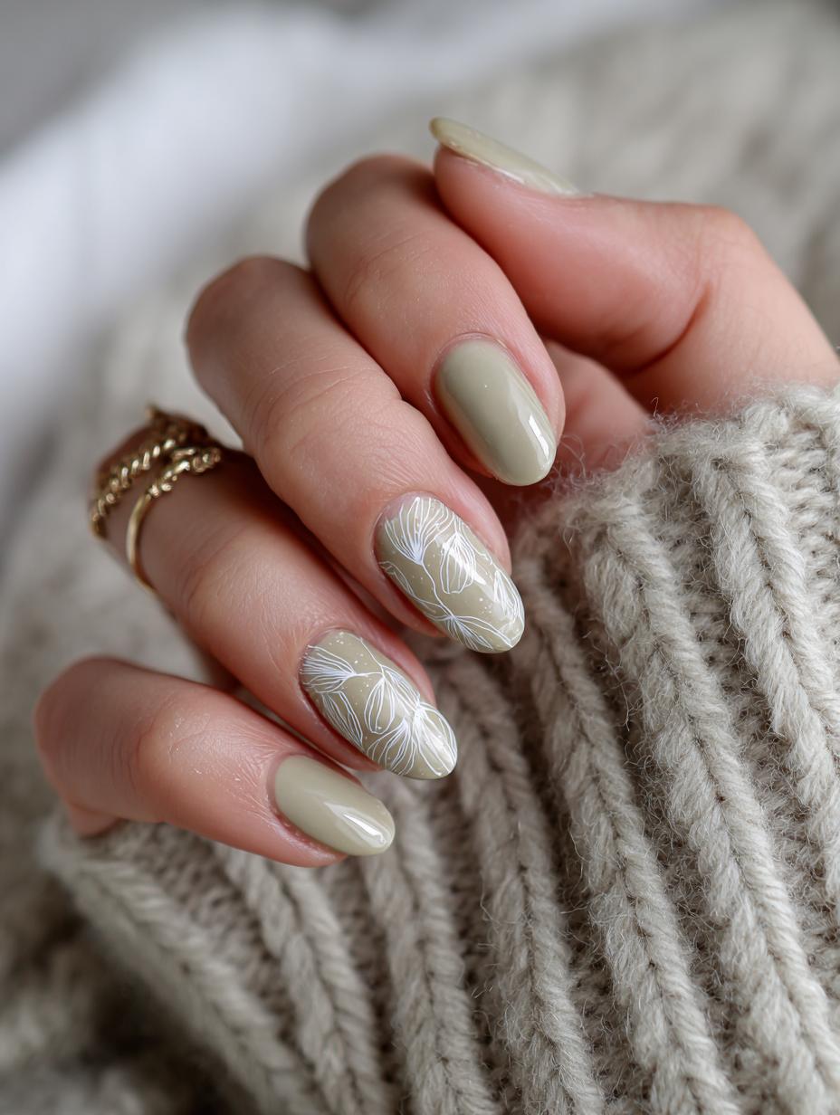 This sophisticated nail design perfectly embodies the quiet luxury trend with its muted sage green base and delicate white botanical line art. The oval-shaped nails feature an elegant alternating pattern – some nails showcase the solid sage polish while others display intricate white floral and leaf motifs painted over the green base. This earthy, minimalist manicure captures the essence of understated elegance, making it perfect for those who want nail art that whispers rather than shouts. The neutral color palette and organic botanical designs create a timeless look that complements any outfit while adding a touch of artistic refinement.