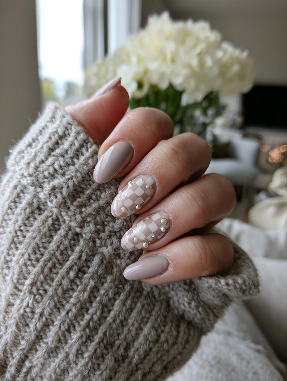 This stunning manicure combines the timeless elegance of nude-pink base tones with an intricate checkerboard pattern in soft taupe and cream. Delicate pearl embellishments add a luxurious three-dimensional element that catches the light beautifully. The almond-shaped nails create a sophisticated silhouette that’s perfect for those who appreciate understated glamour with artistic flair.