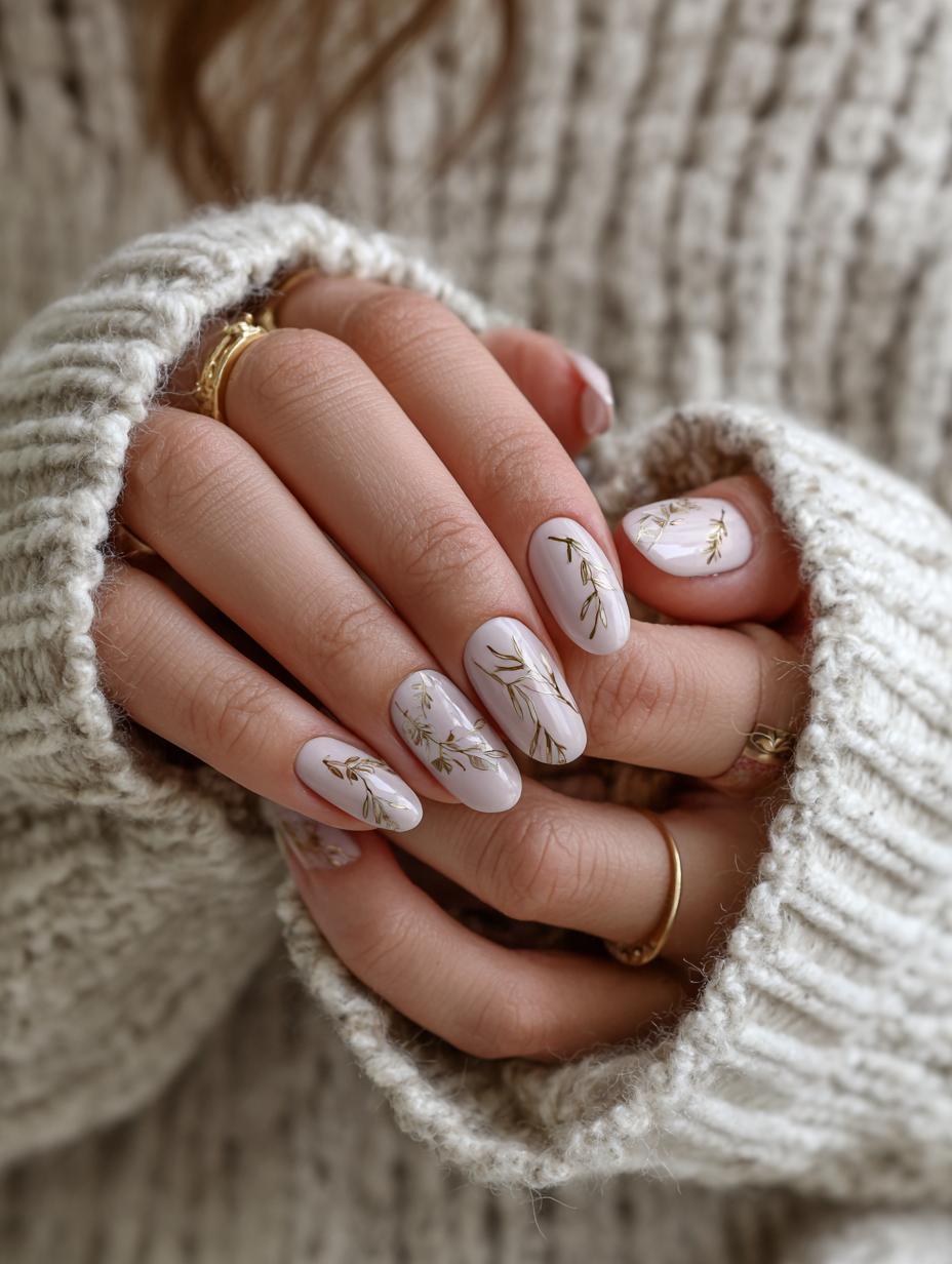 Delicate Gold Botanical Nail Art on Nude Base