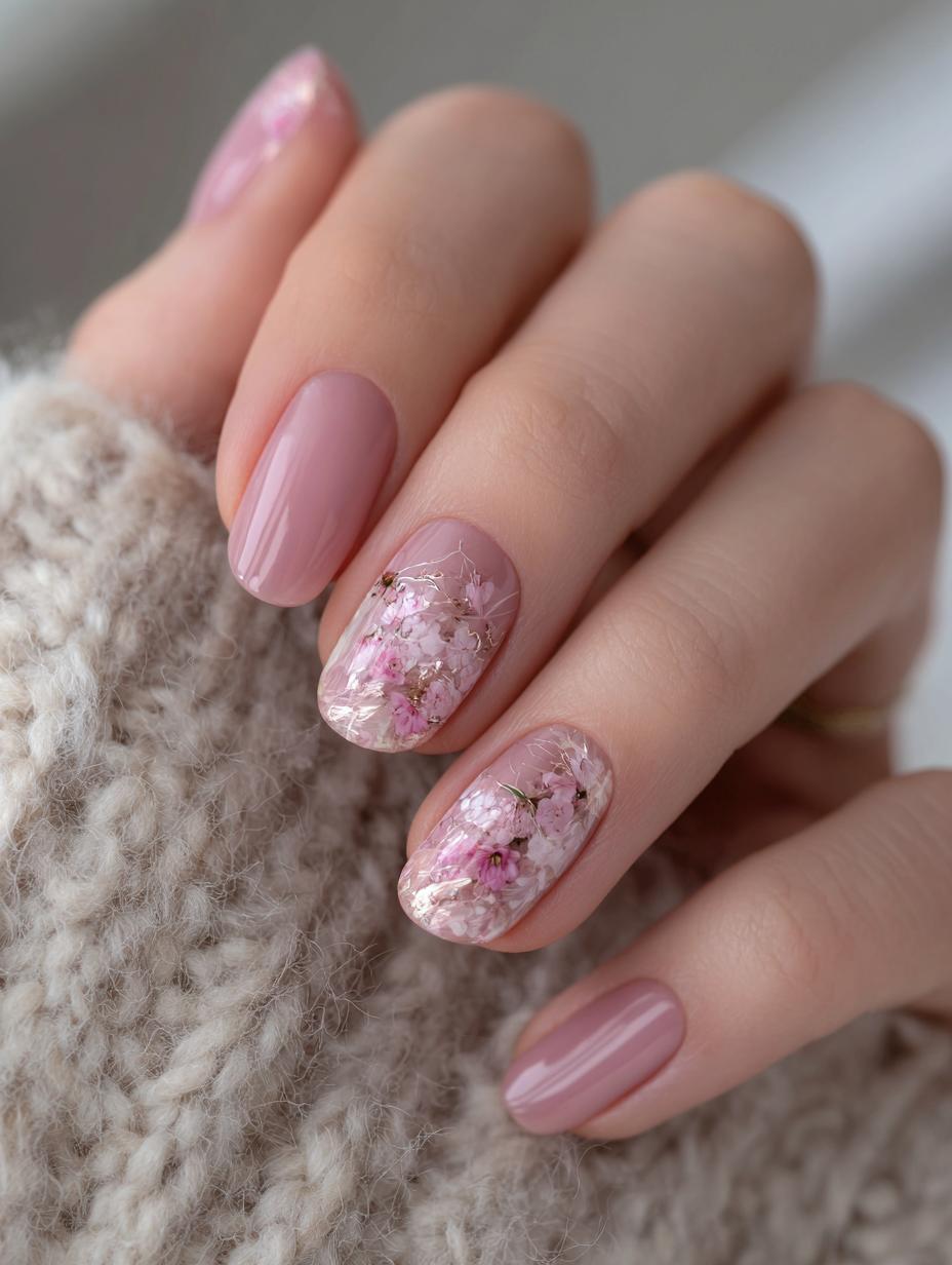 This ethereal manicure showcases the epitome of quiet luxury with its soft dusty rose base adorned with real dried flowers encased in clear topcoat. The design features a beautiful contrast between solid pink nails and accent nails decorated with tiny pressed flowers and delicate golden stems, creating an organic, romantic aesthetic that’s perfect for spring occasions or anytime you want to add a touch of natural elegance to your look.