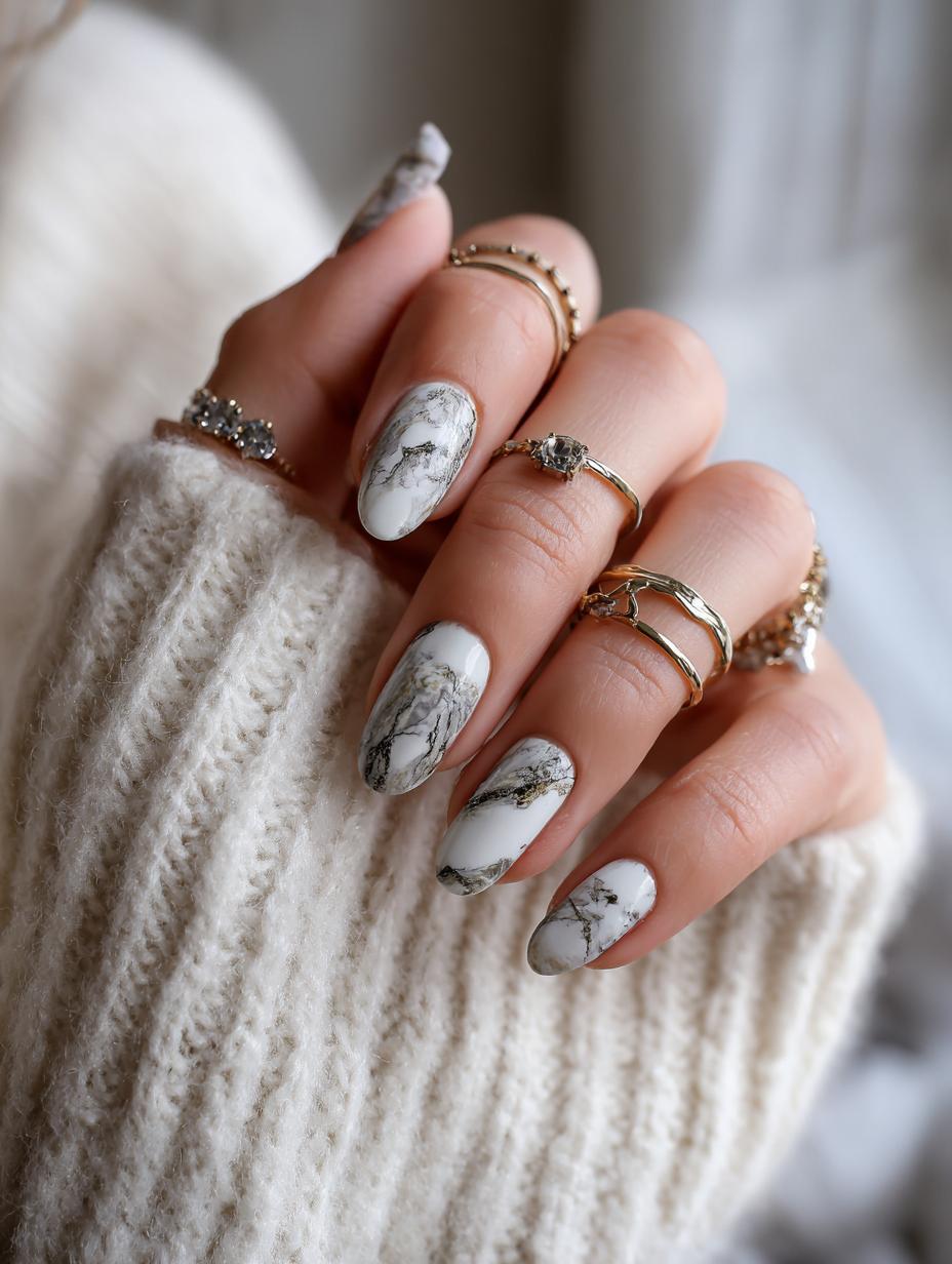 This sophisticated marble nail design perfectly embodies quiet luxury with its white base and delicate gray veining that mimics natural stone. The oval nail shape adds elegance while the subtle marble pattern creates visual interest without being overwhelming. Paired with an array of delicate gold rings, this look demonstrates how understated nail art can be the perfect complement to fine jewelry, creating a cohesive aesthetic that whispers rather than shouts luxury.