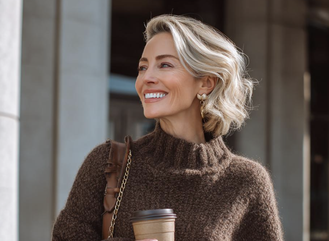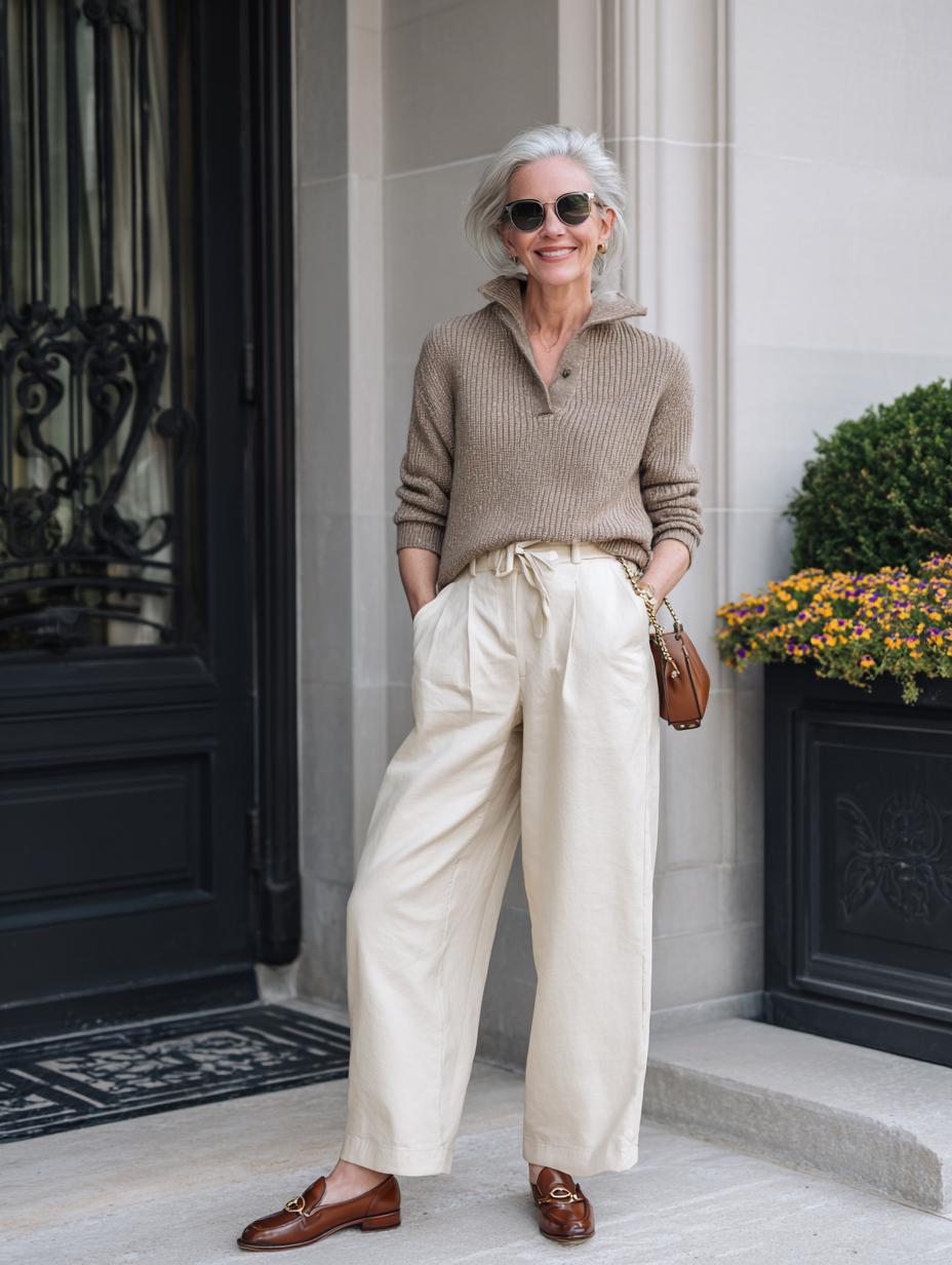 Silver hair pairs beautifully with this refined neutral palette that screams understated wealth. The ribbed taupe sweater delivers cozy luxury while wide-leg cream trousers create an effortlessly polished silhouette. Cognac leather loafers and a matching mini bag add rich warmth to the monochromatic scheme. Aviator sunglasses complete this investment-worthy look that transitions seamlessly from upscale errands to leisurely lunches with friends.