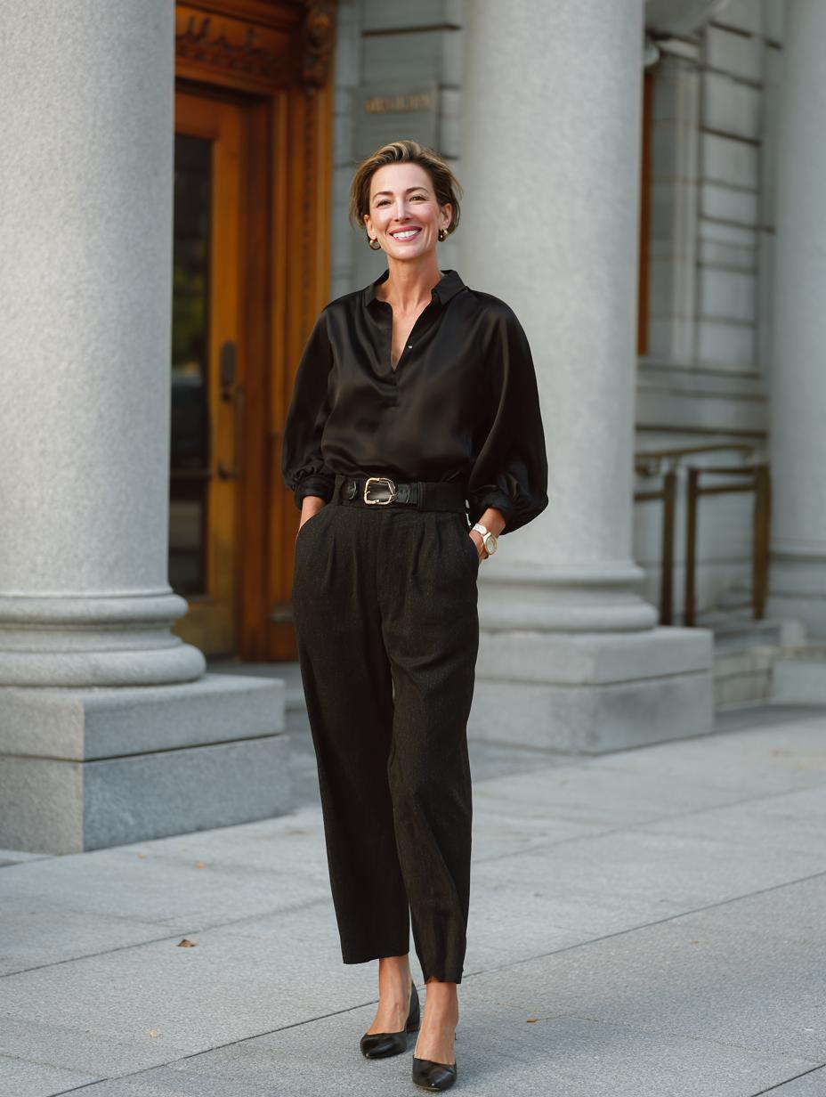 Olive silk separates create commanding boardroom presence without sacrificing feminine sophistication. The flowing blouse tucks seamlessly into high-waisted trousers, while a sleek leather belt defines the silhouette. Black pointed-toe pumps ground the ensemble with timeless elegance. This polished coordination speaks fluent C-suite while maintaining effortless wearability from morning meetings through evening networking events.