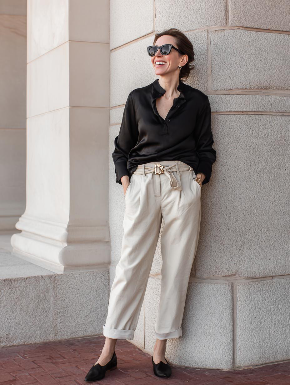 Black silk button-down shirts paired with high-waisted cream trousers create an instantly sophisticated foundation that speaks fluent luxury. The oversized silhouette balances perfectly with tailored proportions, while classic black leather loafers ground the look in timeless elegance. Roll the cuffs, add statement sunglasses, and watch this combination transition seamlessly from boardroom presentations to gallery openings with unmatched refinement.