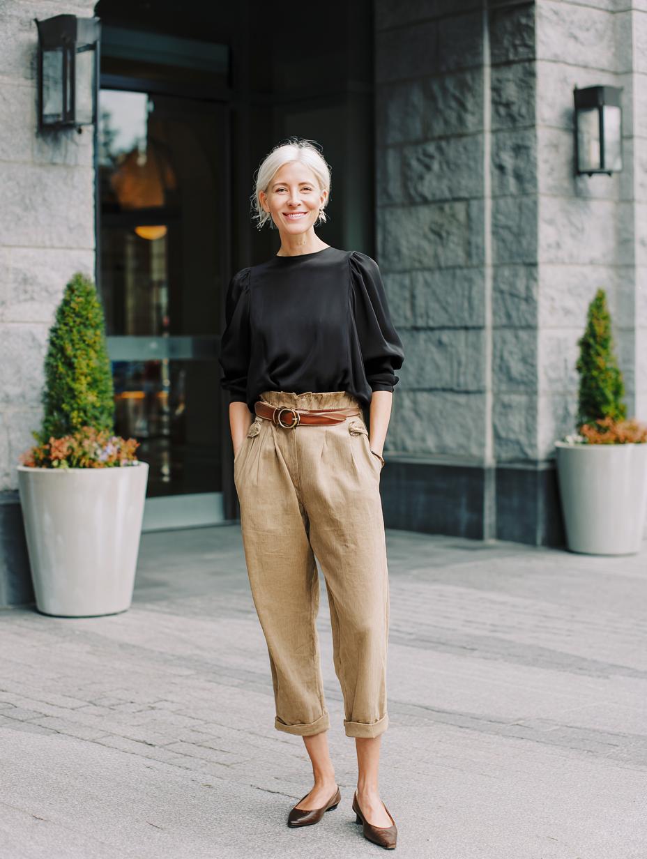 Camel linen paper bag trousers anchor this sophisticated ensemble with their relaxed drape and polished cuffs. The black silk blouse creates striking contrast while maintaining the outfit’s refined sensibility. A cognac leather belt cinches the waist perfectly, elevating casual comfort into boardroom-worthy luxury. This combination proves that understated elegance requires investment pieces that speak volumes through impeccable cut and premium fabrics.