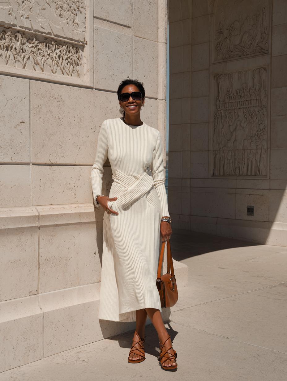 Cream ribbed knit transforms into architectural elegance with strategic waist-cinching that sculpts every curve. The midi length strikes sophisticated balance while long sleeves maintain modesty with modern appeal. Cognac leather accessories ground the monochromatic palette, creating effortless luxury that transitions seamlessly from gallery openings to upscale brunches. This investment piece delivers maximum impact through impeccable fit and timeless silhouette.
