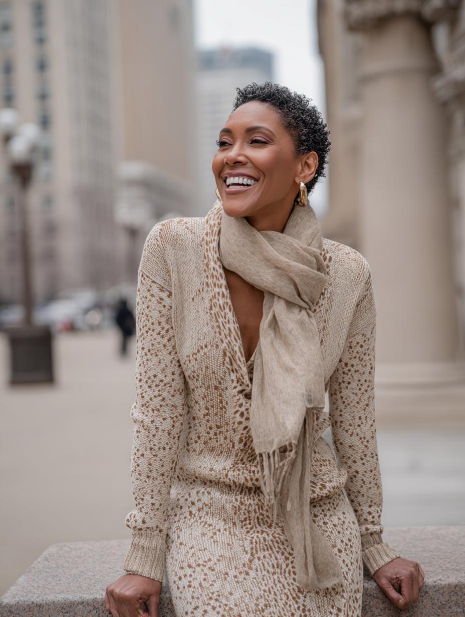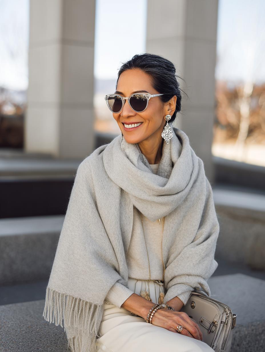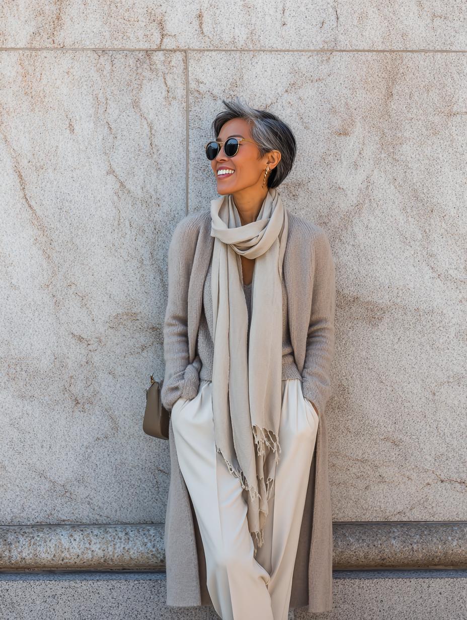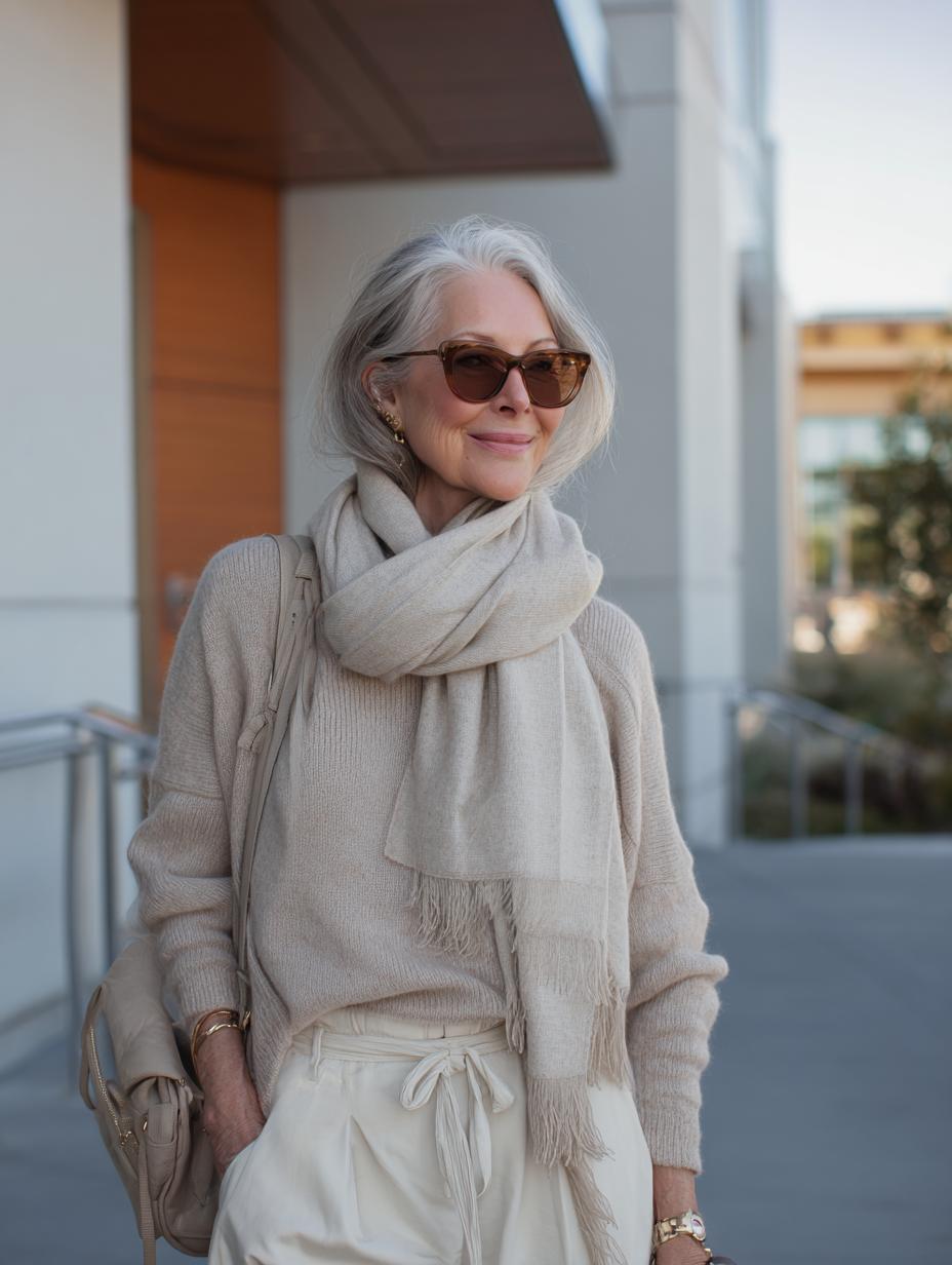 Luxurious cashmere knits paired with flowing wide-leg trousers create an effortlessly sophisticated statement. Silver hair becomes the ultimate accessory against this tonal beige palette, while tortoiseshell sunglasses add editorial polish. The oversized scarf transforms simple separates into investment-worthy luxury, proving that quiet elegance speaks louder than logos. Perfect for gallery openings or upscale brunch dates.