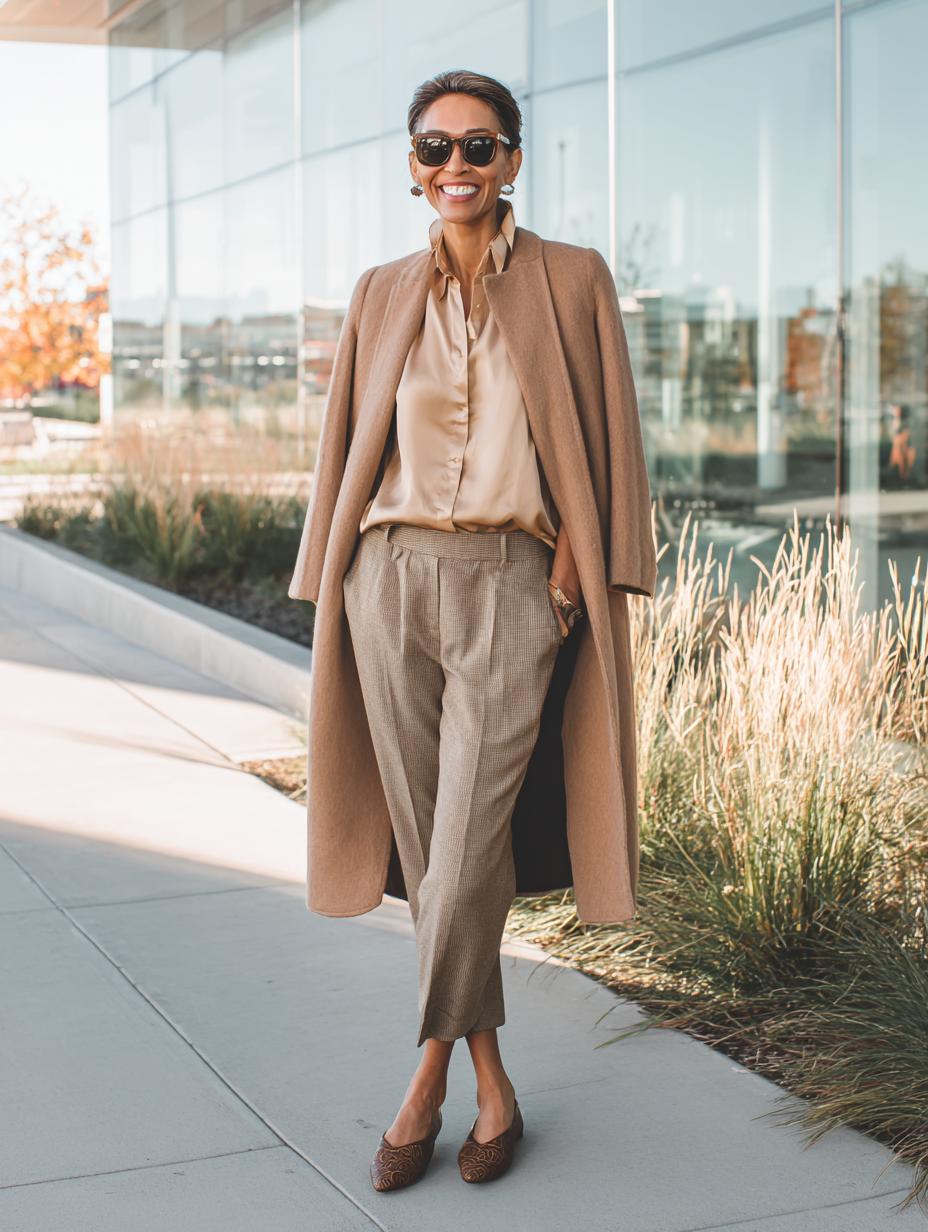 Camel wool creates the ultimate sophisticated silhouette when draped over coordinated neutral separates. Beige silk blouse pairs seamlessly with textured taupe trousers, while tortoiseshell sunglasses add timeless polish. Rich brown leather loafers ground the monochromatic palette with luxurious texture. This refined combination transforms everyday essentials into investment-worthy pieces that exude understated confidence and modern minimalism.