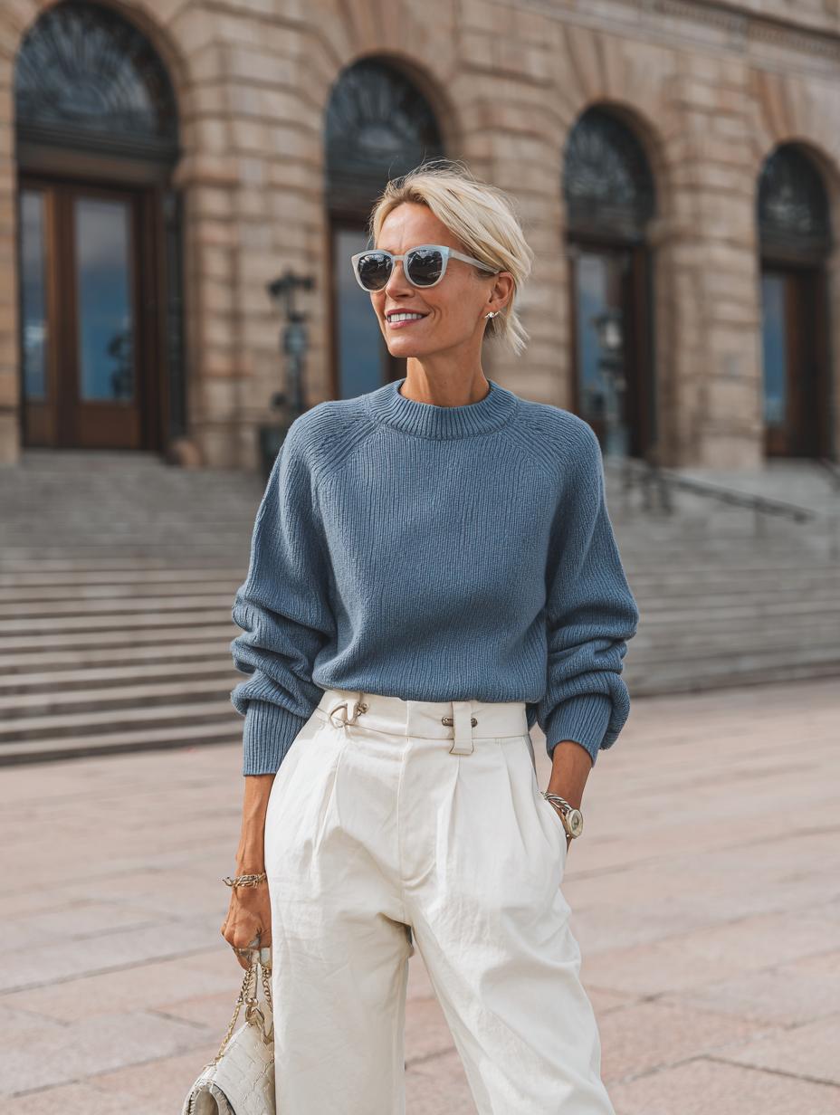 Powder blue cashmere creates the perfect foundation for contemporary luxury dressing. High-waisted cream trousers with pleated details elevate casual sophistication while maintaining comfort. Tortoiseshell sunglasses and delicate gold jewelry add refined finishing touches. The relaxed silhouette paired with tailored bottoms strikes an ideal balance between approachable warmth and polished professionalism, making this combination perfect for upscale brunch dates or gallery openings.