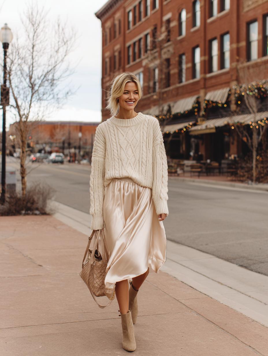 Cream Cable-Knit Meets Champagne Silk for Urban Holiday Elegance