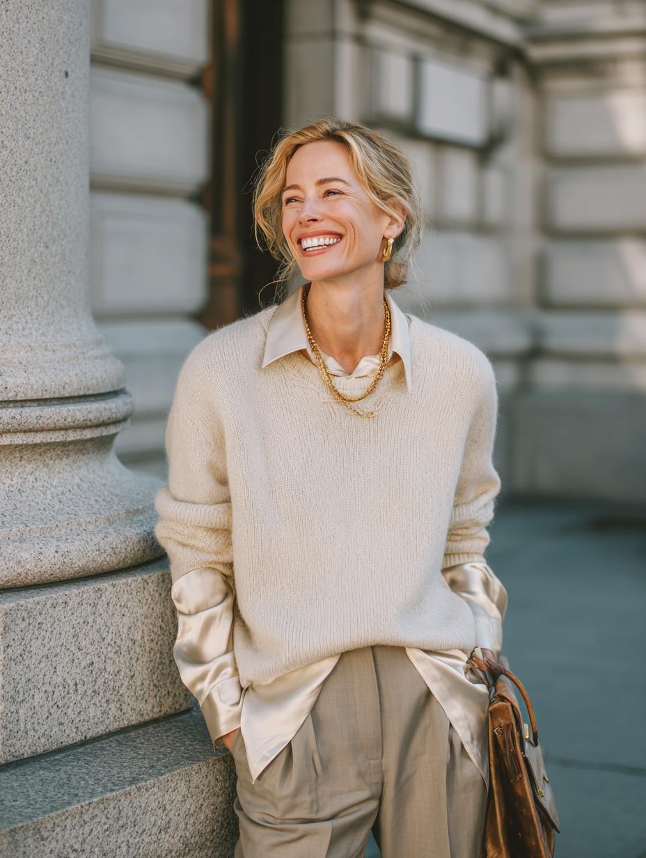 Cream cashmere sweaters anchor this effortlessly polished ensemble, layered over crisp white shirting for textural contrast. Wide-leg trousers in matching neutral tones create a cohesive monochromatic foundation that photographs beautifully. Gold chain necklaces add just enough metallic accent without overwhelming the palette. Perfect for gallery openings, upscale brunches, or client meetings where understated elegance speaks volumes.
