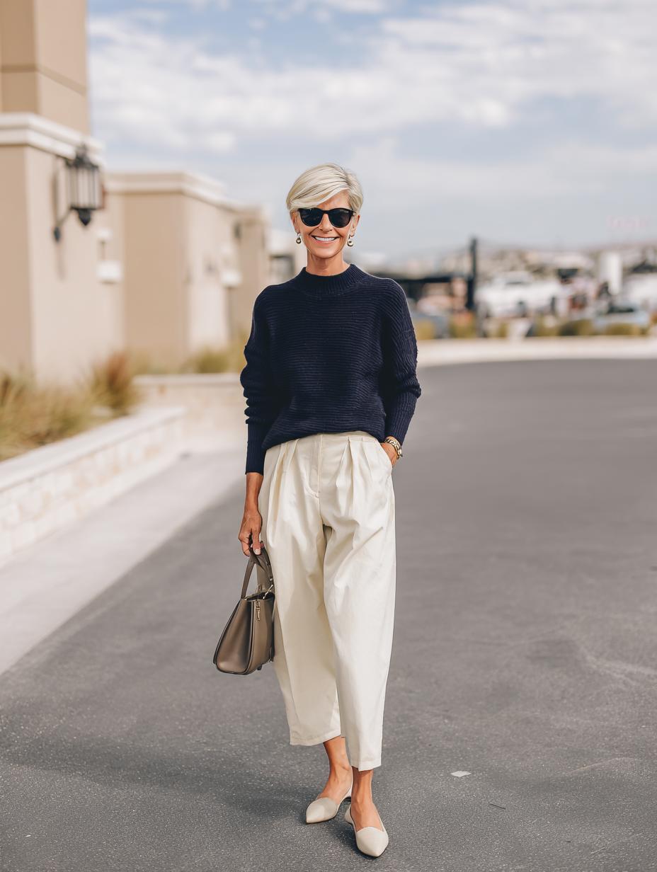 Navy ribbed knit sweaters paired with flowing cream trousers create an understated luxury that whispers wealth without screaming logos. Perfectly tailored wide-leg silhouettes balance cozy textures while neutral tones maintain sophisticated restraint. Dark aviator sunglasses and structured leather accessories complete this investment-worthy ensemble that transitions seamlessly from morning coffee meetings to evening gallery openings.