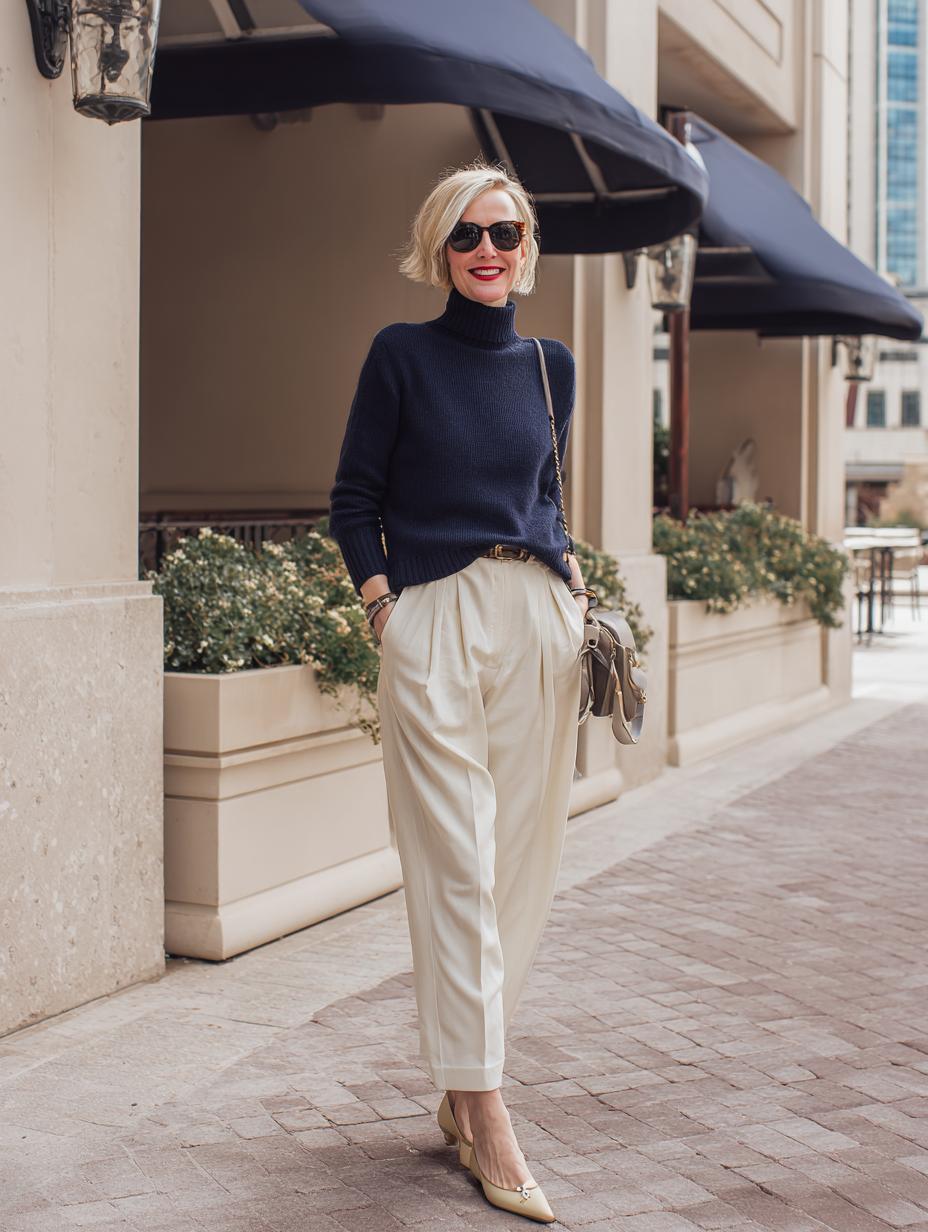Navy ribbed knitwear paired with high-waisted cream trousers creates an effortlessly sophisticated foundation for luxury dressing. The relaxed turtleneck balances the structured silhouette of pleated wide-leg pants, while nude pointed-toe pumps elongate the legs. A slim leather belt defines the waist, and oversized sunglasses add that coveted understated glamour that speaks volumes without saying a word.