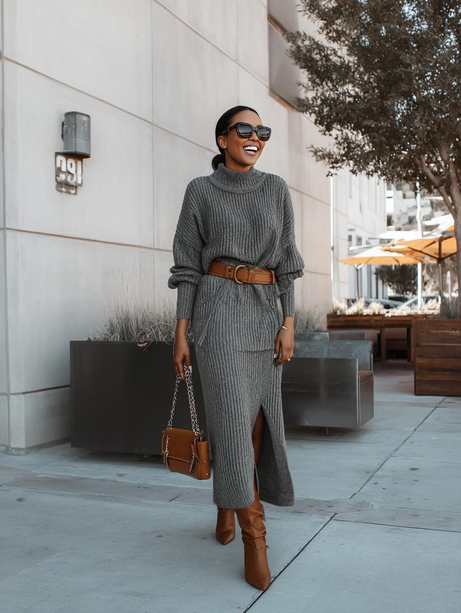 Charcoal ribbed knit transforms into sophisticated elegance when cinched with cognac leather at the waist. The turtleneck silhouette creates sleek lines while the midi length adds modern polish. Brown leather accessories ground the monochromatic palette, proving neutral tones deliver maximum impact. Oversized sunglasses complete this effortlessly chic ensemble that transitions seamlessly from brunch meetings to evening cocktails.