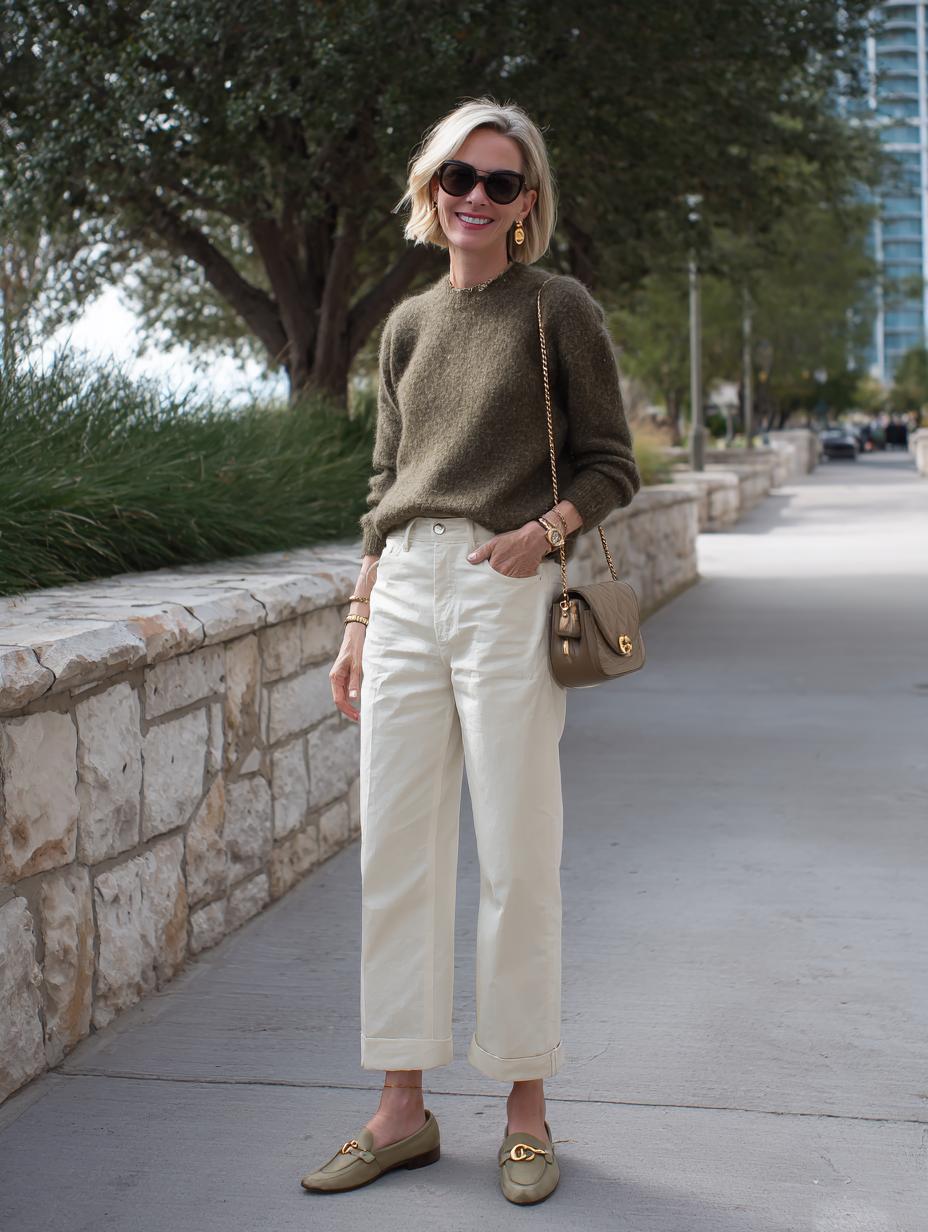 Olive cashmere creates an effortlessly chic foundation when paired with crisp cream wide-leg trousers. Gold hardware accessories elevate the neutral palette, while luxe loafers add understated elegance. The relaxed silhouettes balance comfort with refinement, proving that quiet luxury thrives in thoughtful color coordination and premium textures.