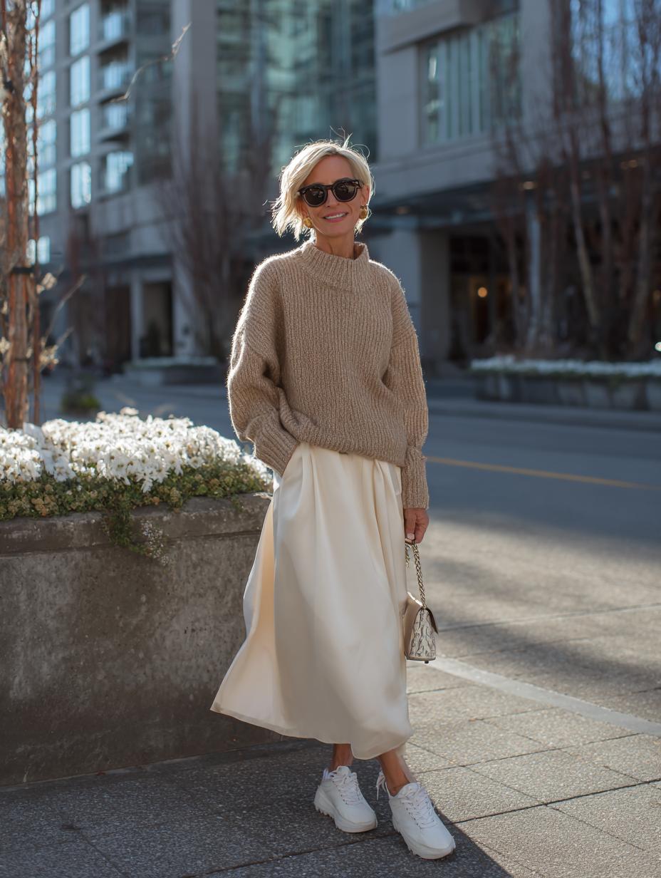 Camel knit sweaters paired with flowing cream midi skirts create the perfect balance between cozy and sophisticated. White chunky sneakers ground this elevated ensemble while adding contemporary edge. The monochromatic neutral palette exudes understated wealth, proving that luxury whispers rather than shouts. This combination works effortlessly from gallery openings to weekend brunches, embodying the quiet luxury aesthetic that defines modern sophistication.