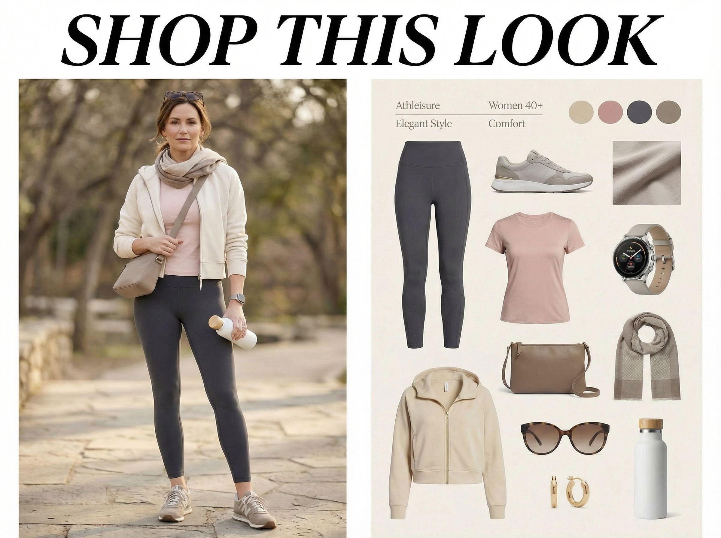 This look blends polished neutrals with relaxed athleisure pieces, creating an outfit that feels both comfortable and quietly sophisticated. Soft layers, sleek leggings, and understated accessories come together for a style that’s effortlessly elegant for everyday wear.