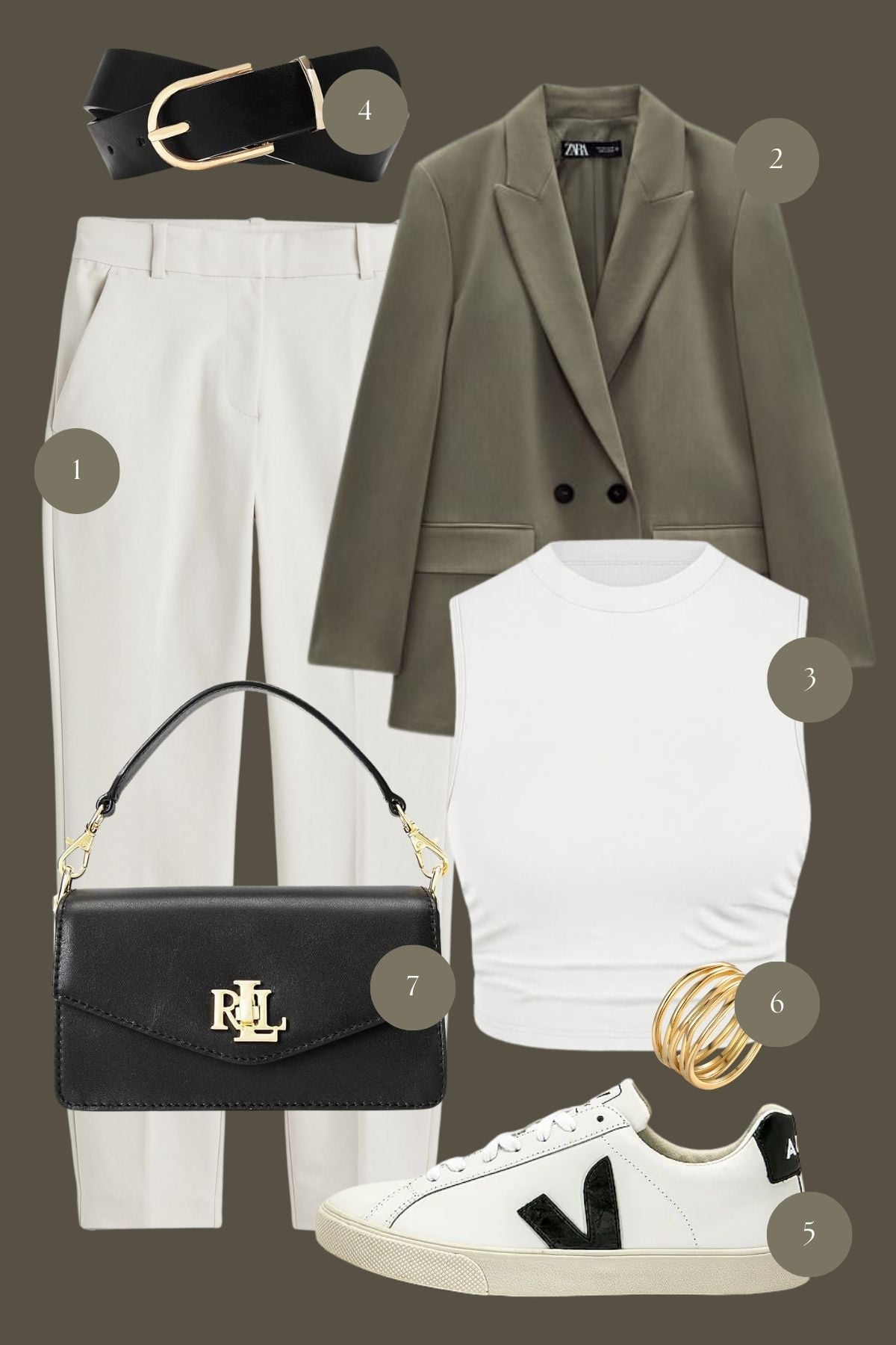 This moodboard is a curated blend of modern monochrome pieces, creating a look that’s both sleek and effortlessly casual. It features a timeless ensemble that begins with a crisp white sleeveless turtleneck, a perfect balance of sophistication and simplicity. Over this, an olive blazer adds structured elegance with a touch of contemporary color. The outfit is anchored by classic cream trousers, providing a seamless transition from formal to leisure. Complementing the look is a chic black belt, cinching the waist and adding definition. Casual white sneakers with a black accent break the formality, introducing a relaxed, street-style vibe.