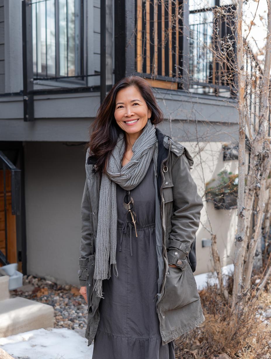 Olive green utility coats transform basic midi dresses into sophisticated winter statements. Layer a ribbed knit scarf over the dress but under the coat for dimension that doesn’t add bulk. The cinched waist creates an hourglass silhouette while the longer coat length elongates your frame. Choose neutral tones throughout for a cohesive, polished look that works from errands to dinner dates.