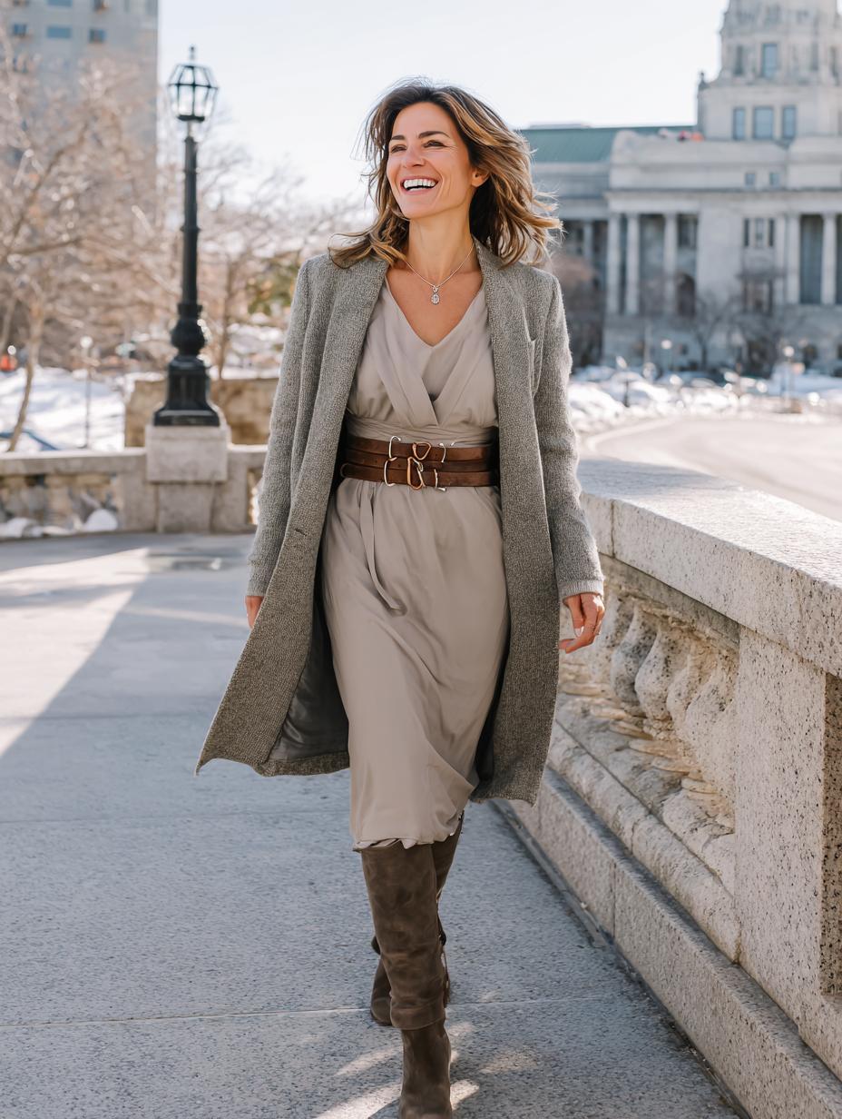 Neutrals become absolutely stunning when layered with intention and purpose. A flowing wrap dress in soft taupe creates feminine curves while the wide leather belt defines your waist perfectly. Brown suede boots add rich texture, and the long grey coat provides sophisticated polish. This combination proves that monochromatic dressing creates the most flattering silhouette.