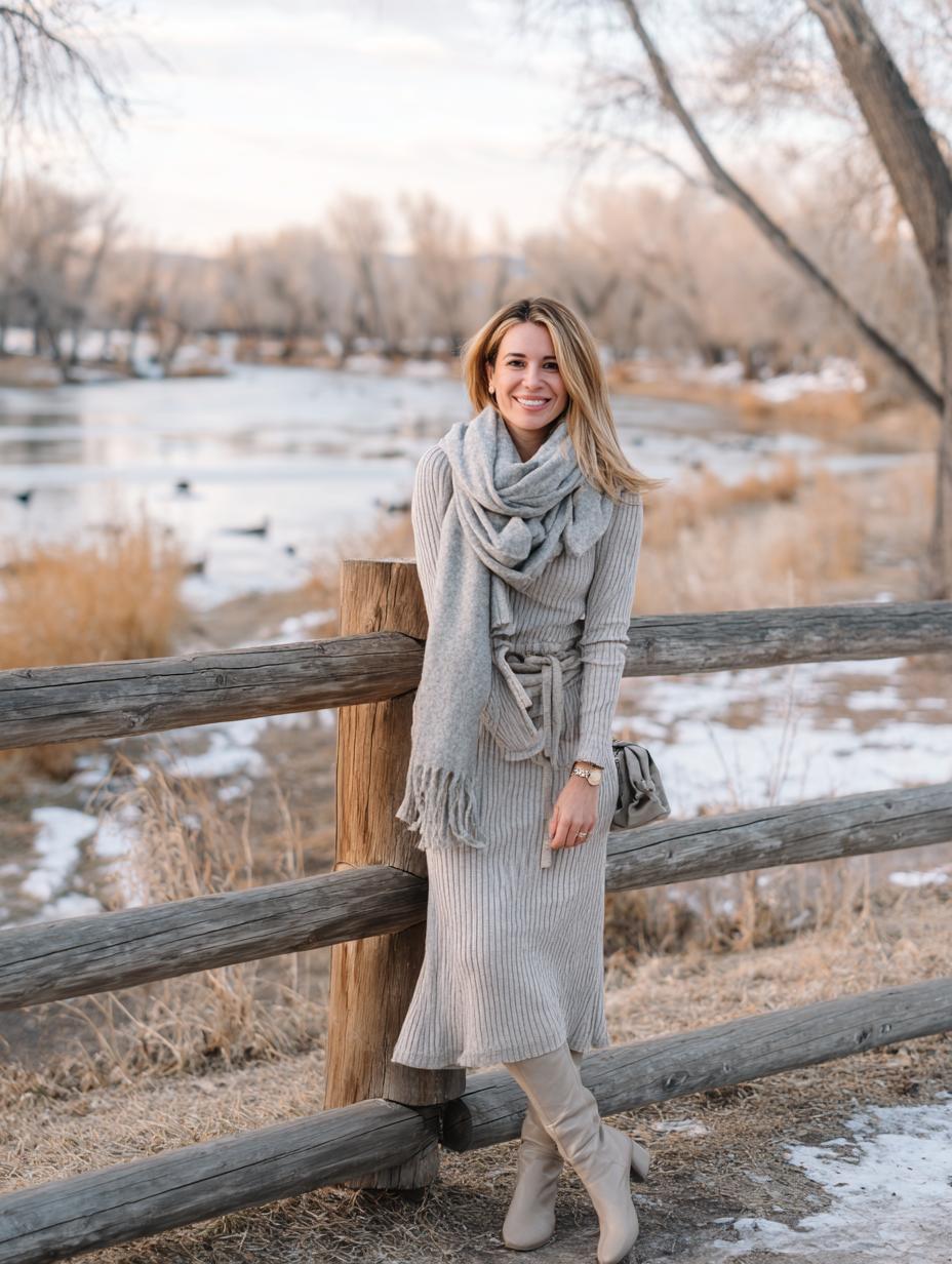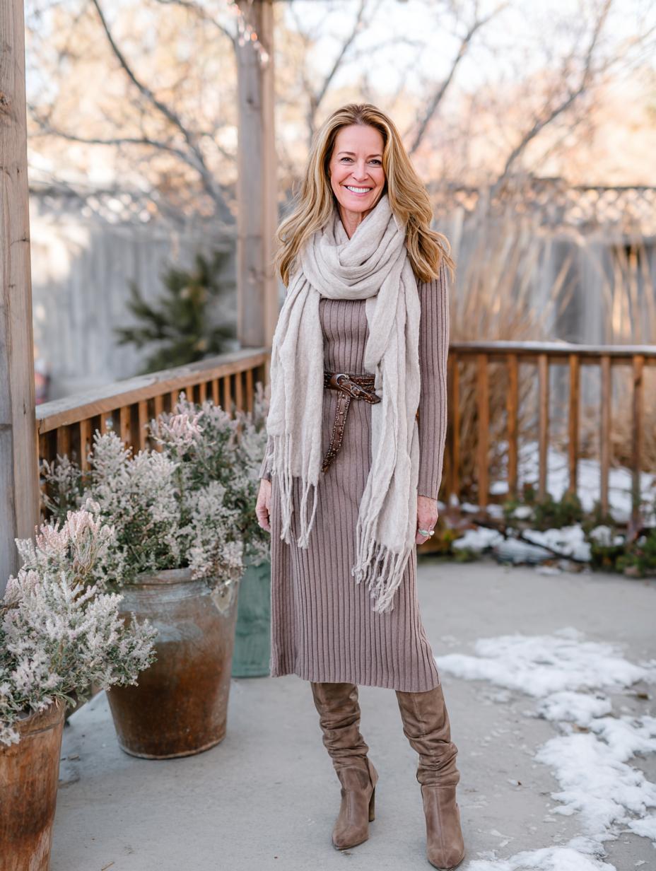 Ribbed sweater dresses become instant classics when styled with luxurious textures and warm neutrals. Layer a cream cashmere scarf for softness while tall suede boots elongate your silhouette beautifully. The woven belt defines your waist perfectly, preventing any shapeless moments that plague midi-length pieces. Monochromatic dressing in earthy tones delivers polish without trying too hard.
