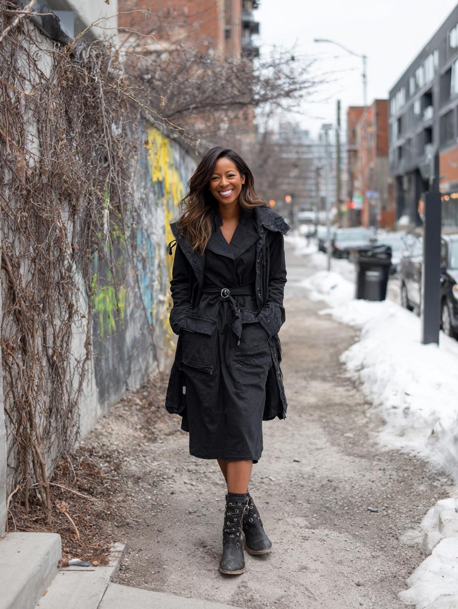 Black leather boots anchor this sophisticated winter look while a structured black trench coat creates instant polish. The midi-length silhouette flatters every figure, and layering adds visual interest without bulk. Hands confidently tucked in pockets showcase the coat’s tailored fit, proving that classic pieces deliver effortless elegance on snowy city streets.