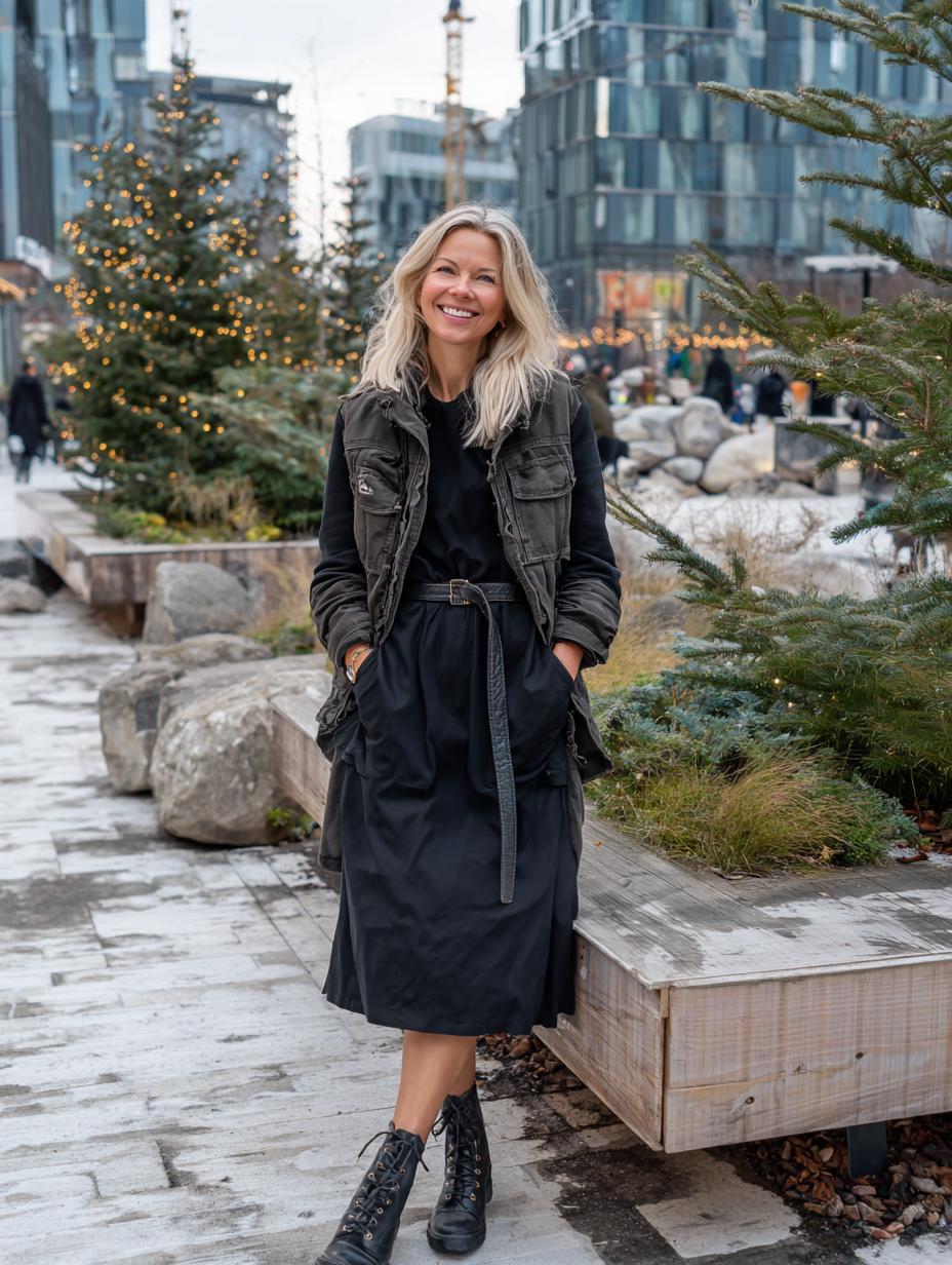 Military olive cargo vest transforms a simple black midi dress into an unexpectedly chic ensemble that flatters every figure. Strategic layering creates vertical lines while the structured vest defines the waist beautifully. Black combat boots ground the look with edgy sophistication, perfect for weekend adventures or casual dinner dates. The belt cinches everything together, creating an hourglass silhouette that skims curves without clinging.