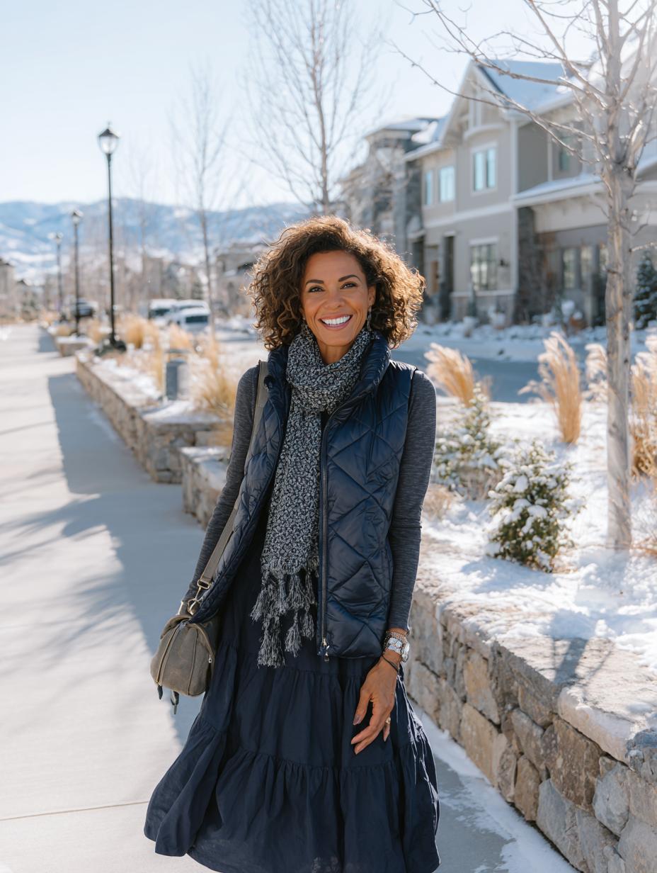 Navy quilted vests become instant outfit elevators when paired with flowing midi dresses and cozy knits. The strategic layering creates a defined waistline while the textured scarf adds visual interest without bulk. Golden hour lighting proves this ensemble works beautifully for weekend errands or casual coffee dates, delivering comfort and sophistication in equal measure.