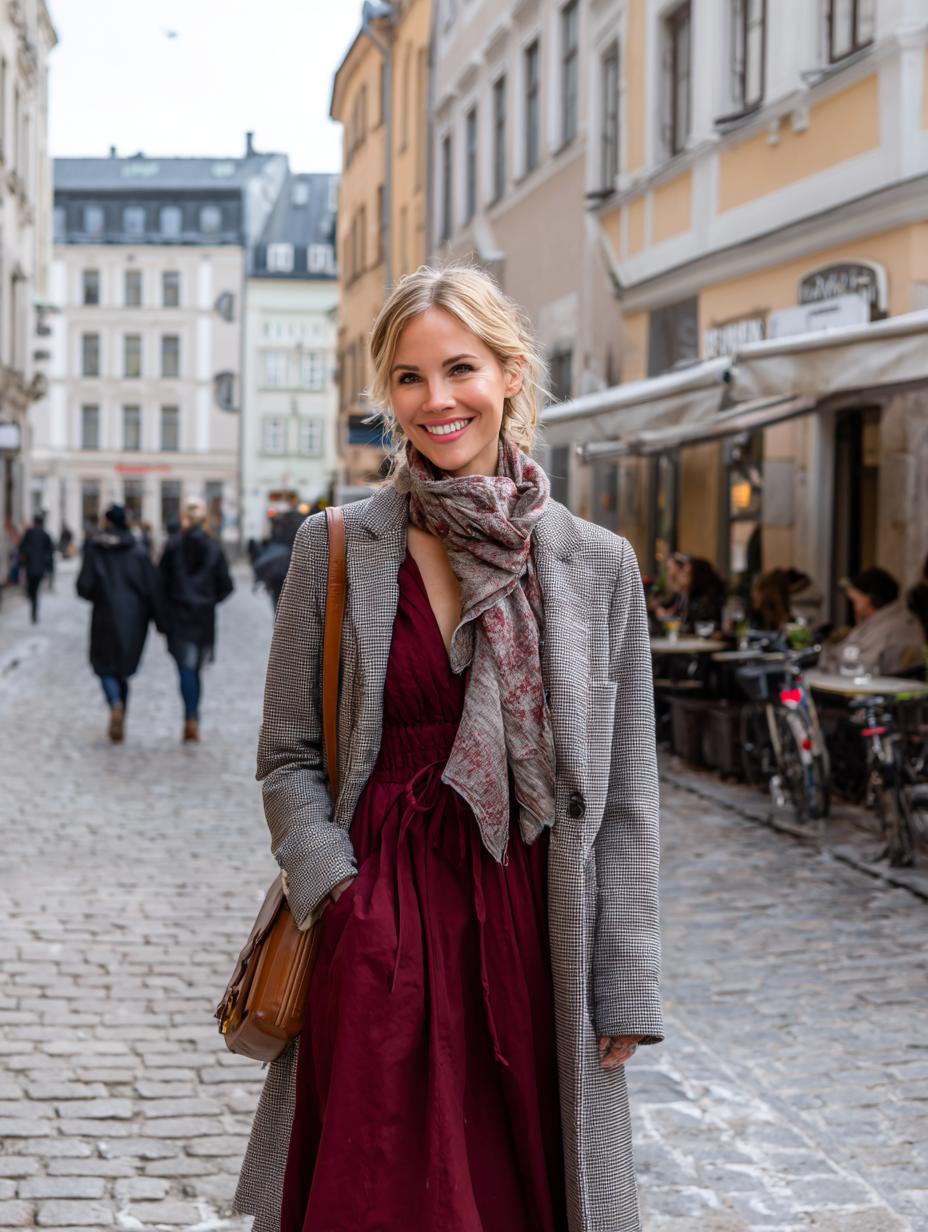 Burgundy steals the spotlight in this sophisticated layered ensemble that proves midi dresses work beautifully under tailored coats. The rich wine-colored dress creates a stunning silhouette while the classic houndstooth coat adds structure and polish. A delicate patterned scarf bridges the gap between feminine and professional, while the cognac leather bag provides the perfect warm accent. This combination works effortlessly for lunch dates, shopping excursions, or cultural outings in the city.