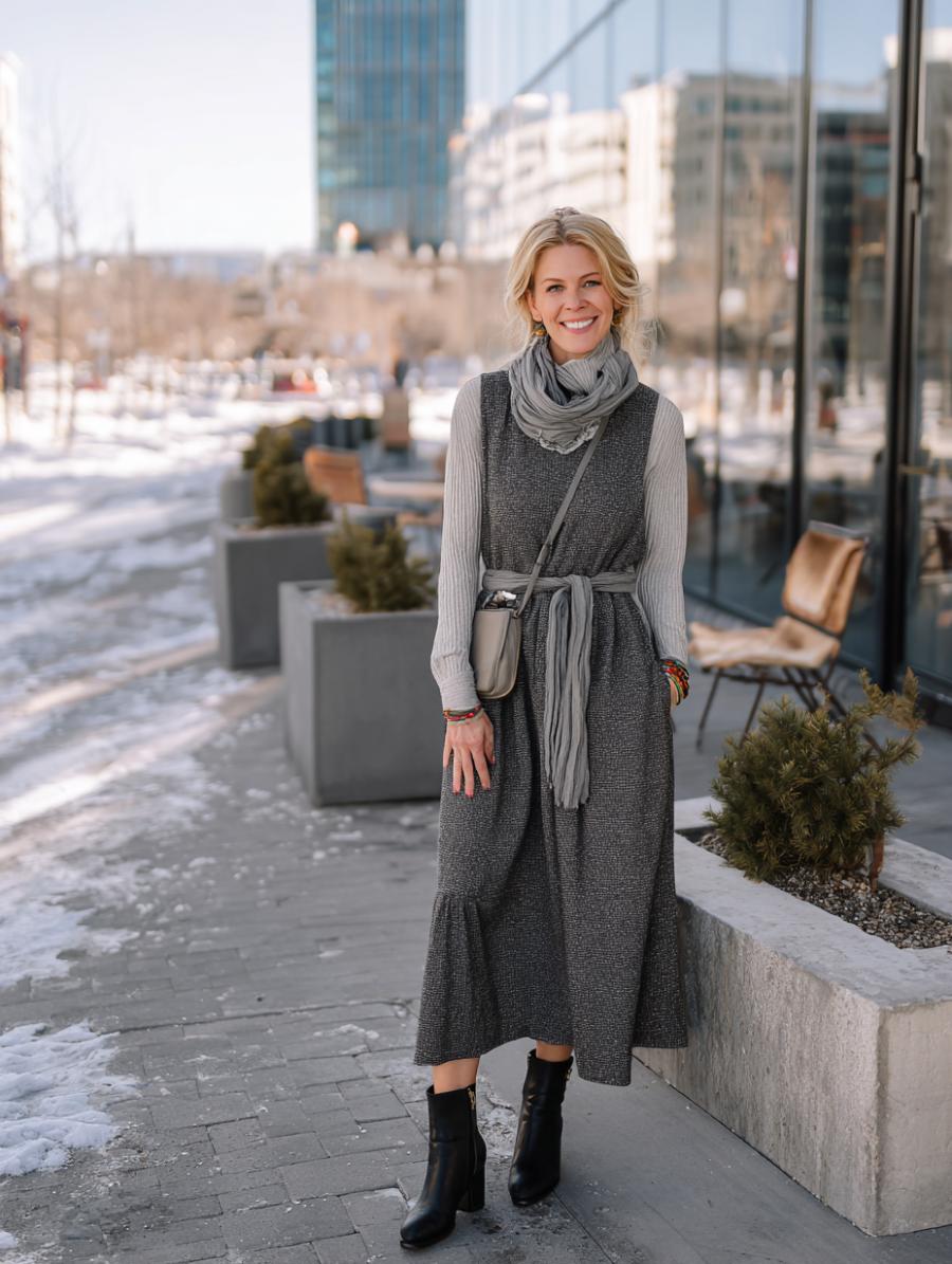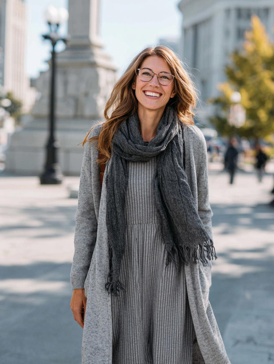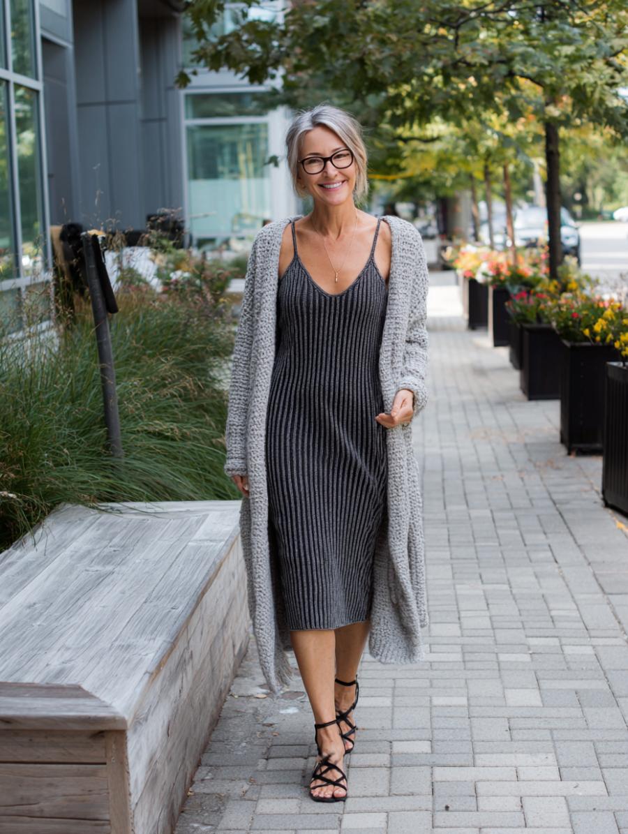 Gray ribbed midi dresses deliver timeless elegance when paired with matching cardigans and textured scarves. The monochromatic palette elongates your silhouette while strategic layering adds dimension without overwhelming your frame. Finish with wire-rimmed glasses for an intellectual polish that works from coffee meetings to weekend strolls through the city.