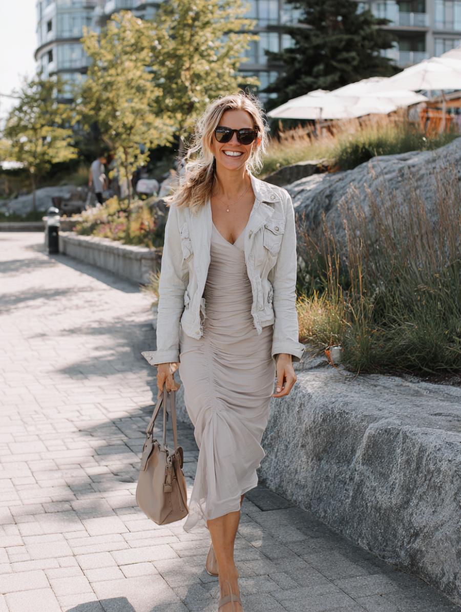 Beige-on-beige coordination creates an unbroken vertical line that elongates your silhouette instantly. The fitted ribbed midi dress hugs curves in all the right places while the structured moto jacket adds edge without bulk. Nude accessories maintain the monochromatic flow, making legs appear miles longer. This sophisticated neutral palette works for brunch dates, shopping trips, or casual office days when you want to look polished yet approachable.
