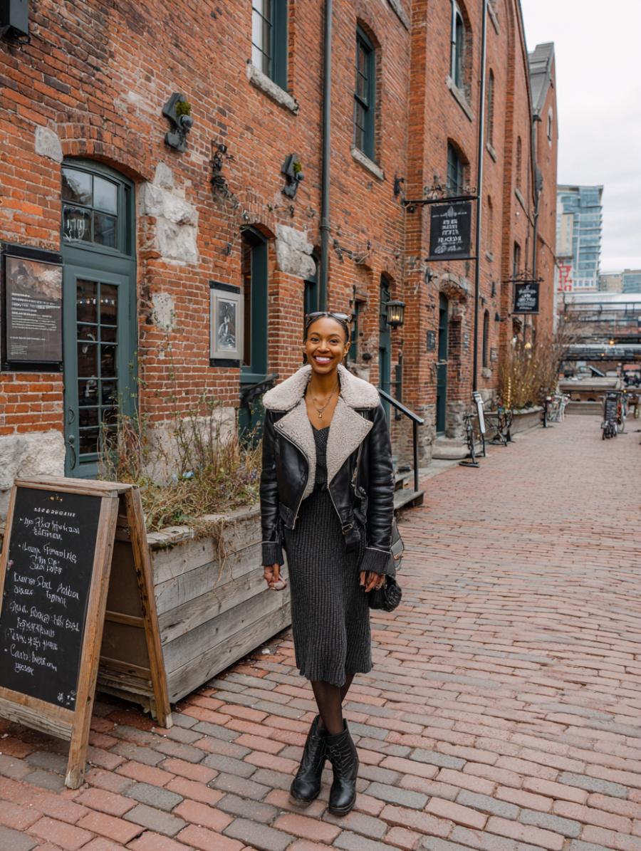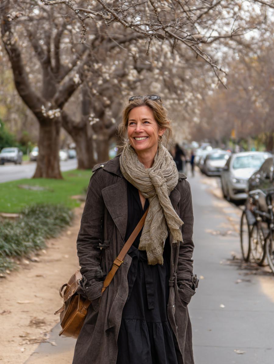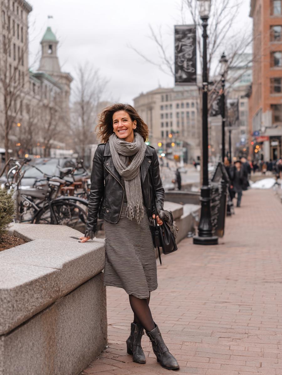 Black leather adds instant edge to any midi dress silhouette, creating the perfect balance between feminine and fierce. Layer a chunky knit scarf in neutral tones to soften the look while adding textural interest. Dark tights and ankle boots ground the ensemble, making it perfect for transitional weather. The windswept hair and confident stride prove that comfort and style go hand-in-hand.