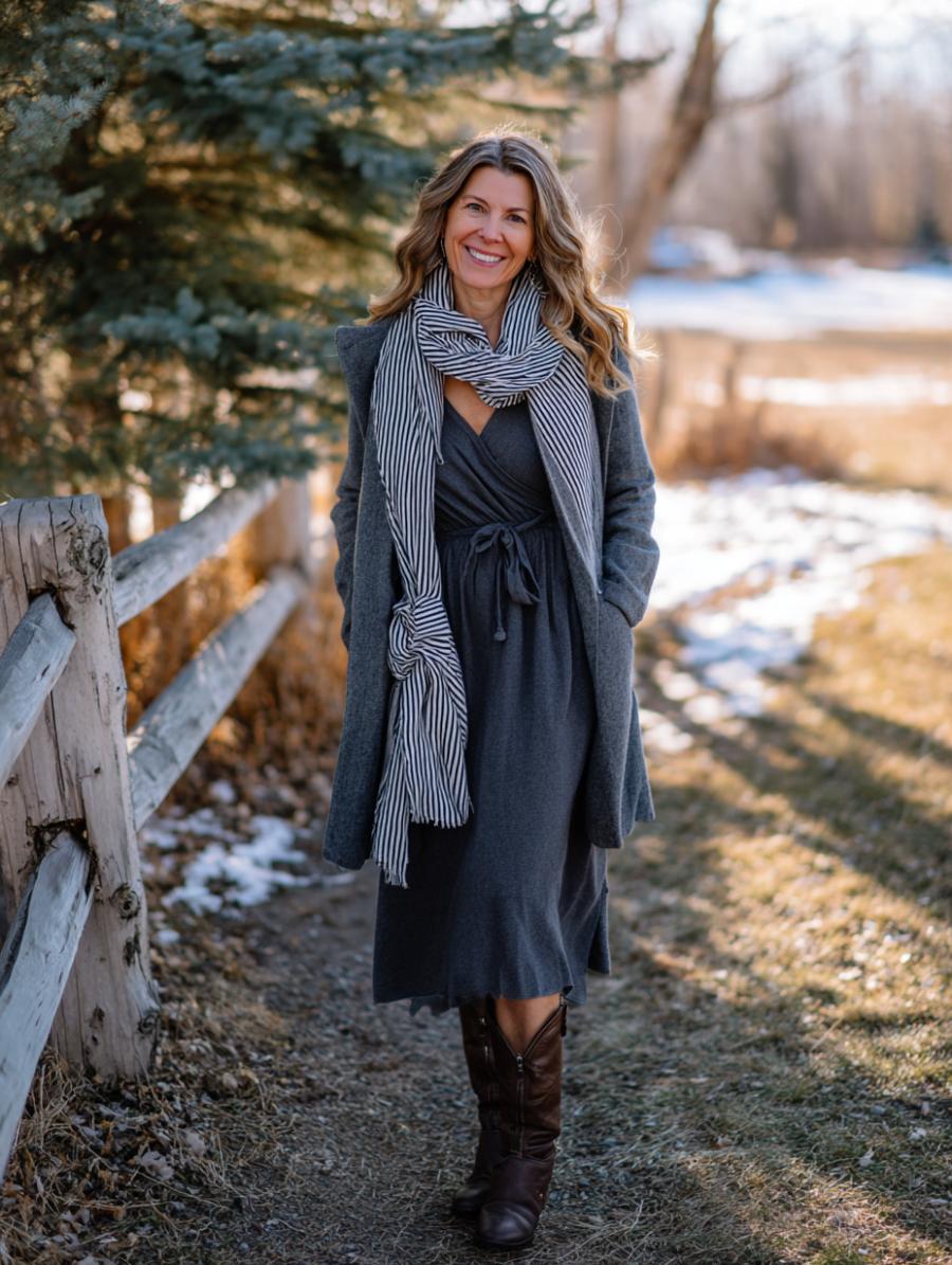 Charcoal jersey wrap dresses work overtime to create an hourglass silhouette while camouflaging problem areas. The tie waist cinches at your narrowest point, while the midi length elongates legs without revealing too much. Layer with a matching long coat and striped scarf to add visual interest while maintaining the streamlined effect. Brown boots ground the monochromatic palette beautifully.