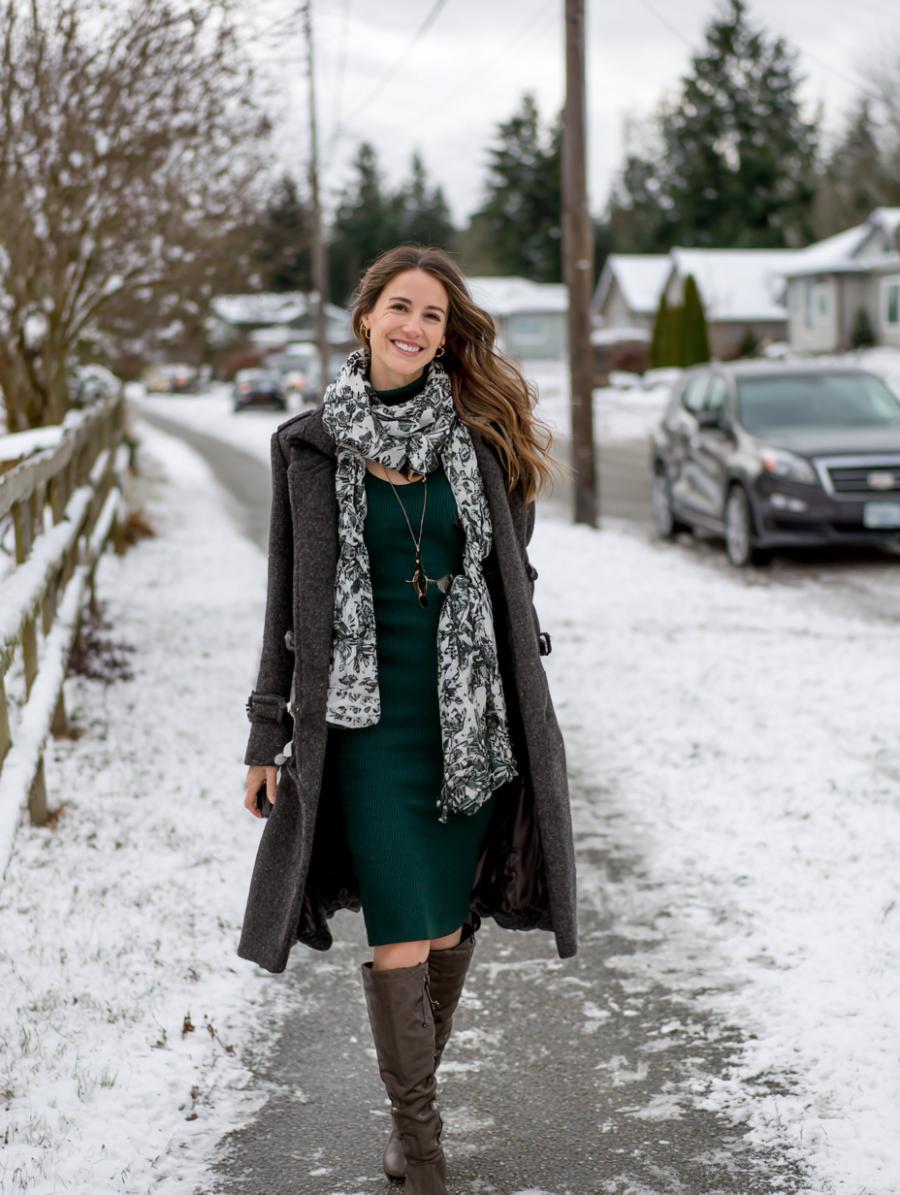 Emerald green creates stunning contrast against snowy backdrops while maintaining sophisticated appeal. Gray wool coat provides structured warmth without overwhelming your silhouette. Patterned scarf adds visual interest and breaks up solid colors beautifully. Over-the-knee boots elongate legs and keep you warm during winter adventures. Layer delicate necklaces for subtle sparkle that catches winter light perfectly.