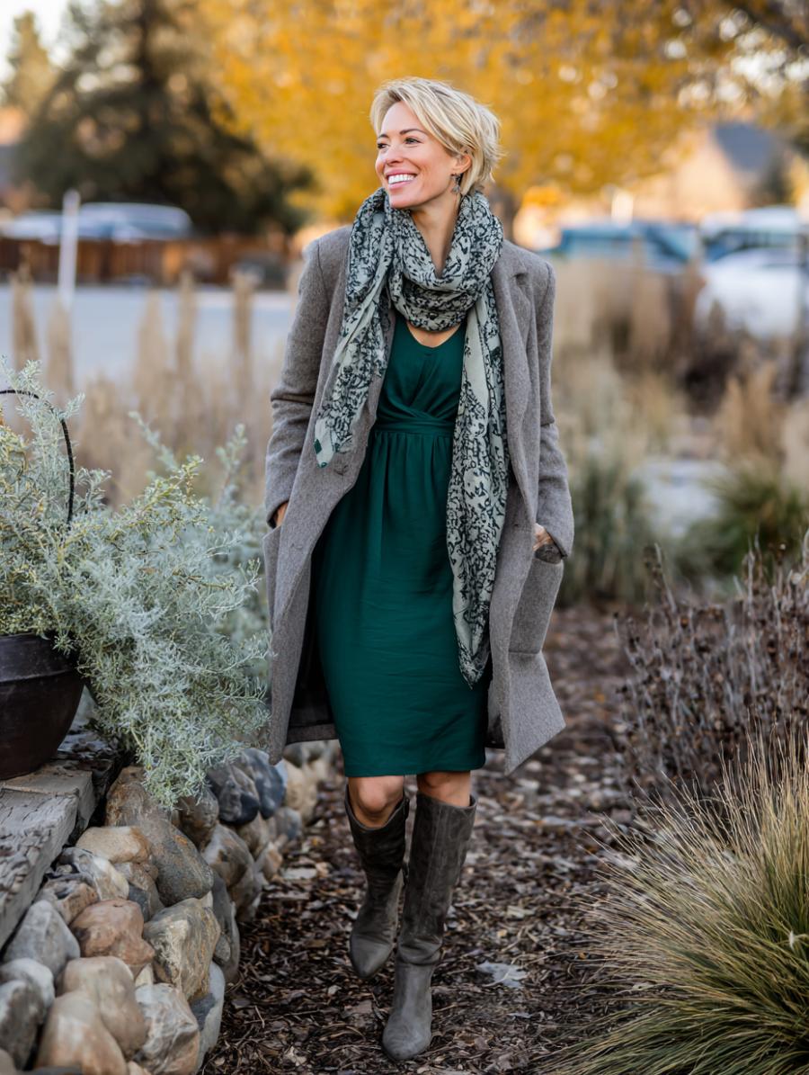 Emerald green captures attention while creating an incredibly flattering silhouette that skims curves beautifully. Layer a tailored gray wool coat over your midi dress for instant sophistication, then add a patterned scarf for texture and visual interest. Tall boots elongate legs and create a polished finish that works perfectly for weekend outings or casual office days. The monochromatic base lets accessories shine while maintaining an effortlessly chic vibe.