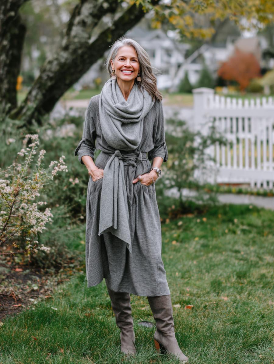 Ribbed knit midi dresses work magic on mature figures when cinched at the waist with a matching belt. The vertical ribbing creates length while the fitted silhouette flatters curves without clinging. Layer with a cozy scarf and knee-high boots for a polished winter look that transitions seamlessly from coffee dates to dinner plans.