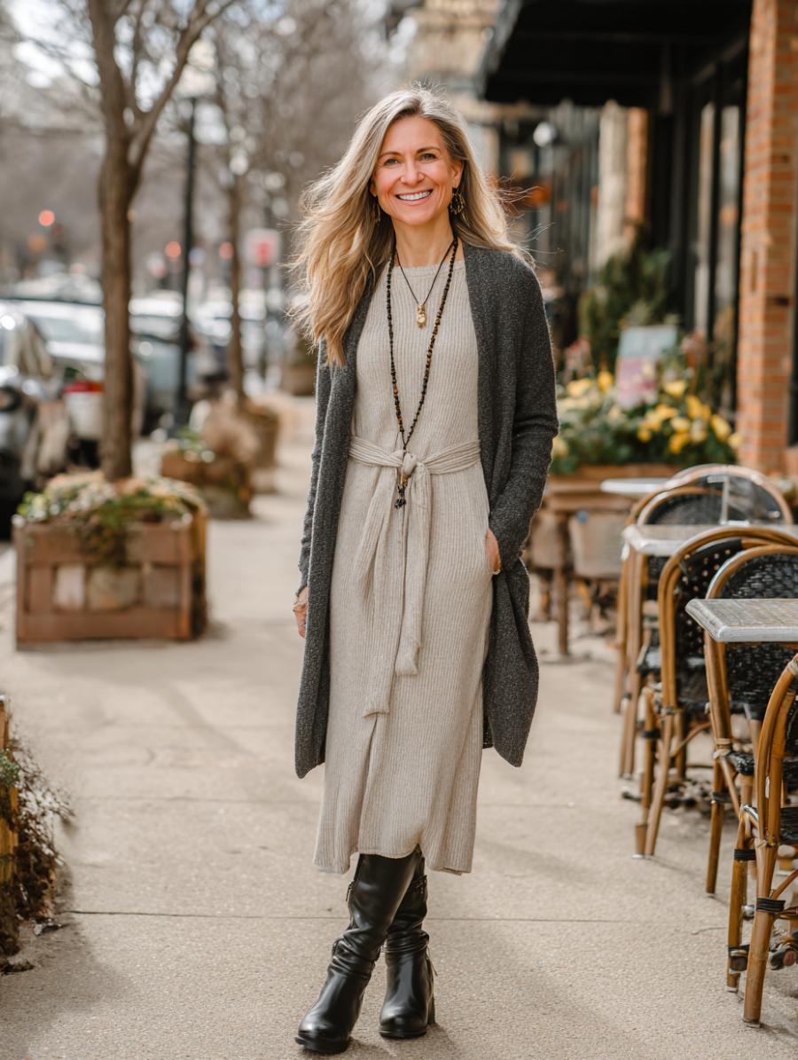 Neutral ribbed knit creates an effortlessly chic foundation when cinched with a matching tie belt at the natural waist. Layering a charcoal longline cardigan adds instant sophistication while maintaining clean lines. Black leather boots ground the look with polished edge, while layered necklaces introduce subtle texture without overwhelming the streamlined silhouette.