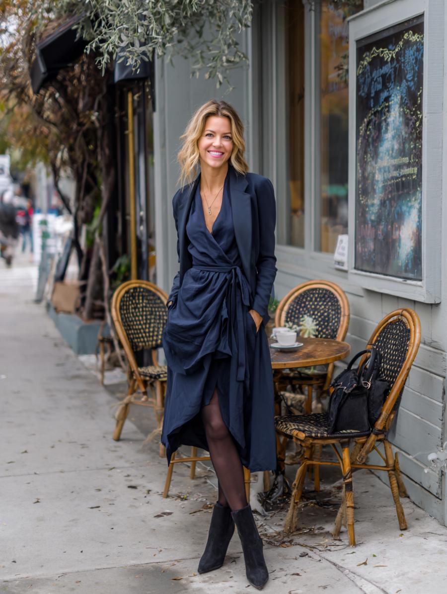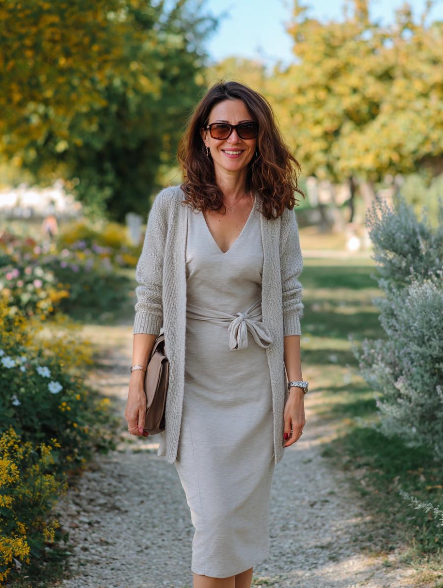 Neutral tones create an instantly polished foundation that works for any age or body type. The wrap-style midi dress cinches at the waist while the long cardigan creates a sleek vertical line that elongates your silhouette. Layer with confidence – the monochromatic palette keeps everything cohesive while the varying textures add visual interest without overwhelming your frame.