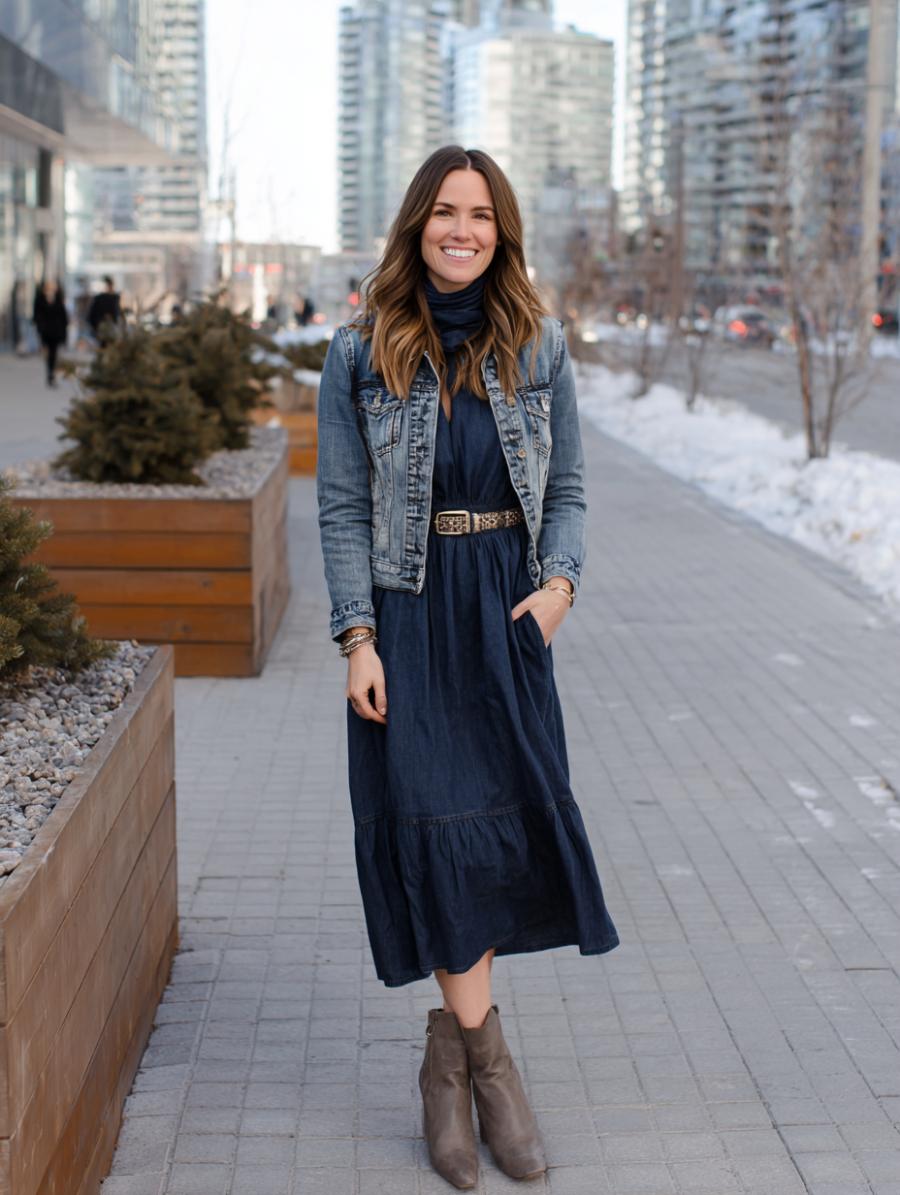 Navy blue midi dresses become instant outfit heroes when layered with classic denim jackets and cinched with statement belts. Brown suede ankle boots ground the look while adding textural interest that prevents any frumpy vibes. Gentle gathering at the hem creates movement and flatters every figure, while the high neckline keeps things sophisticated yet approachable for daytime adventures.