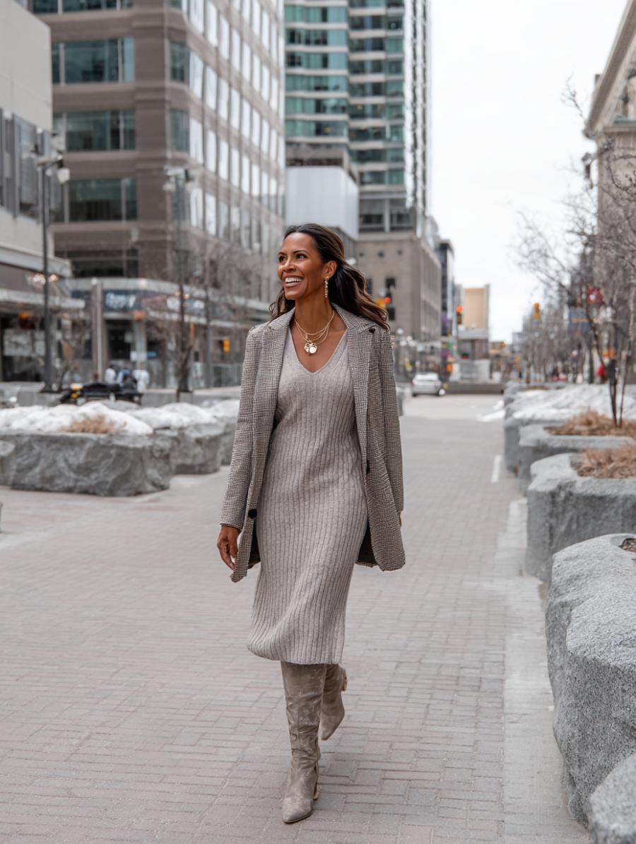 Gray ribbed knit creates an effortlessly polished silhouette that skims curves without clinging. Layer a structured plaid blazer over your midi dress for instant sophistication that works from boardroom to brunch. Suede knee-high boots elongate legs while adding textural interest. Gold layered necklaces break up the monochrome palette and draw attention upward, creating a flattering focal point that’s both modern and timeless.