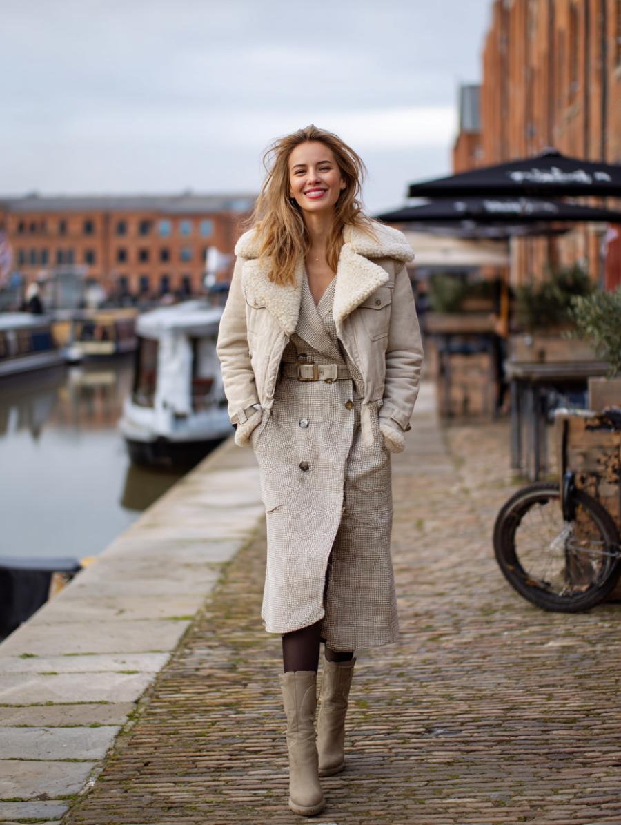Cream shearling-lined aviator jackets transform any midi dress into a sophisticated ensemble that flatters every silhouette. The oversized lapels and fitted waist create an hourglass shape while adding luxurious texture contrast. Tall boots elongate legs beneath the midi hemline, while the belted waist defines your figure without clinging. Perfect for waterfront strolls or weekend brunches when you want polish without trying too hard.