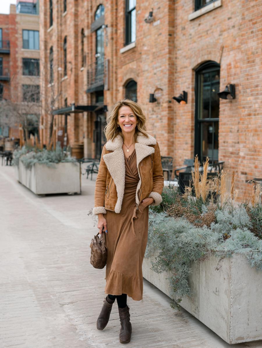 Monochromatic camel layering delivers instant elegance while maintaining a streamlined silhouette. The midi dress wraps beautifully at the waist, creating definition, while the shearling-lined jacket adds texture without overwhelming your frame. Rich brown boots ground the look with earthy sophistication, proving neutral tones never look boring when styled thoughtfully.