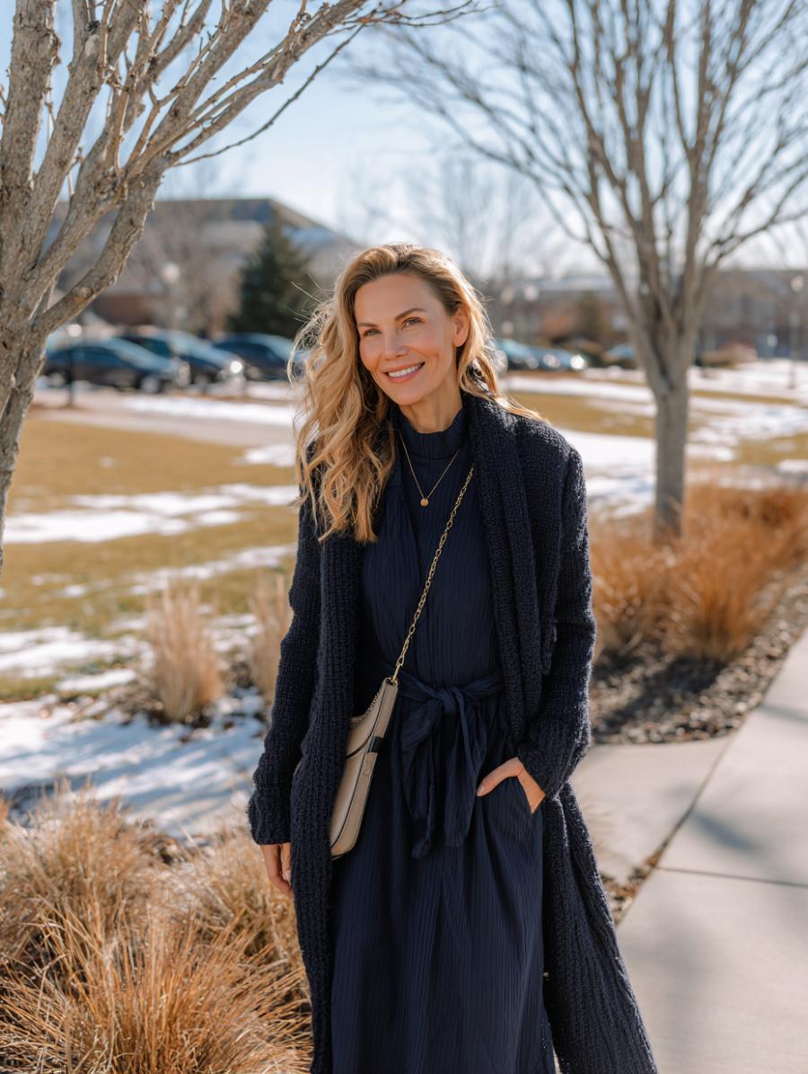 Navy knit midi dresses create instant sophistication when cinched with matching fabric belts. Layer oversized charcoal cardigans for dimension without bulk, keeping proportions balanced through strategic belting at the natural waist. Crossbody bags maintain clean lines while adding practical polish. Golden hour lighting enhances the rich navy tones, proving this monochromatic approach delivers maximum impact with minimal effort for busy women.