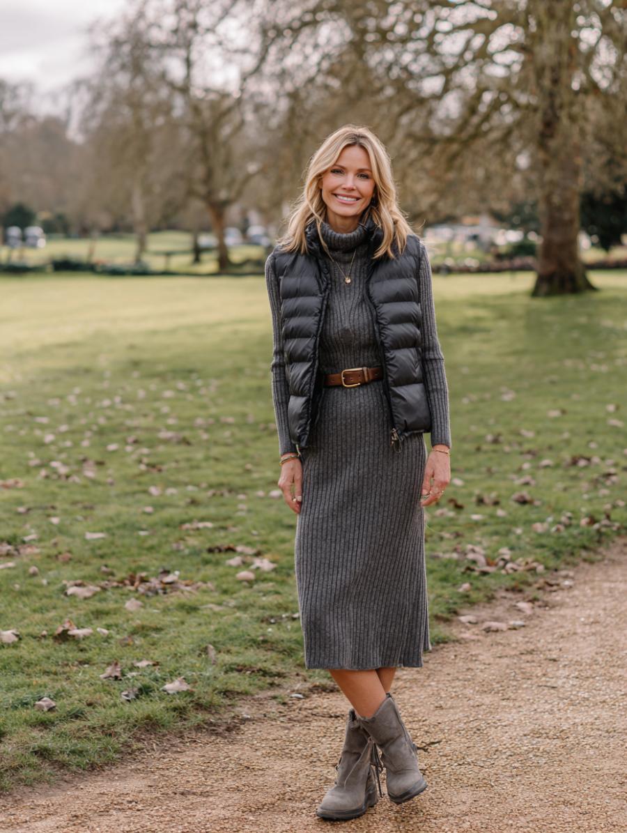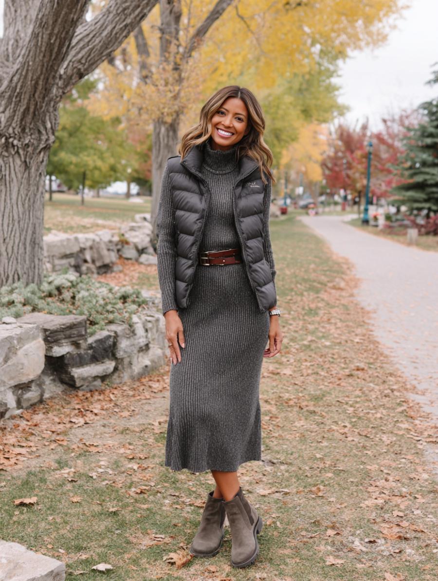 Charcoal ribbed knit creates an effortlessly elongating silhouette when cinched with a cognac leather belt at the waist. Layer a sleek black puffer vest over top for warmth without bulk, keeping the fitted midi dress as your foundation. Gray suede ankle boots ground the monochromatic palette while adding texture contrast. This combination proves that comfort and sophistication work beautifully together for everyday elegance.