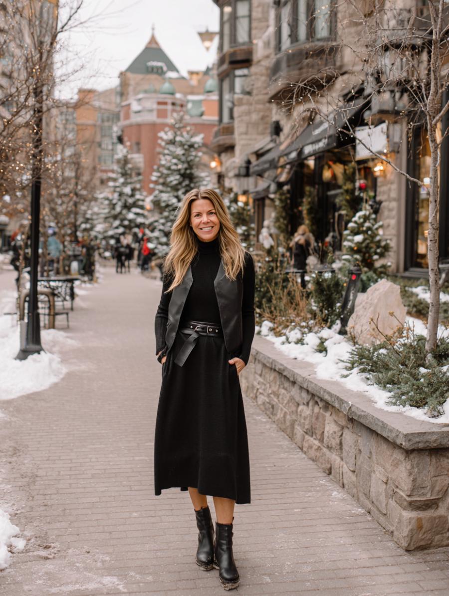 Black turtleneck sweaters paired with flowing midi skirts create instant sophistication without sacrificing comfort. Adding a structured vest elevates the silhouette while maintaining that coveted hourglass shape. Black ankle boots ground the look perfectly, while the monochromatic palette ensures you appear polished and put-together. Winter layering becomes foolproof when every piece works in harmony to flatter your figure.